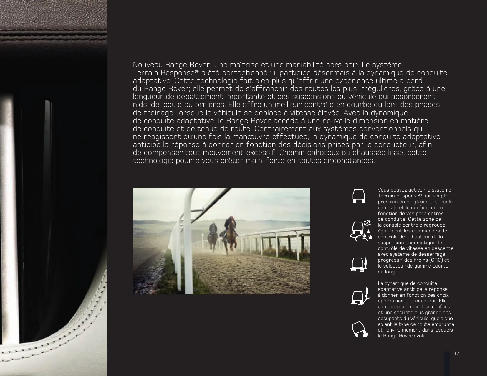 Nouveau Range Rover. Une maîtrise et une maniabilité hors pair. Le système Terrain Response® a été perfectionné : il participe désormais à la dynamique de conduite adaptative. Cette technologie fait bien plus qu’offrir une expérience ultime à bord du Range Rover; elle permet de s’affranchir des routes les plus irrégulières, grâce à une longueur de débattement importante et des suspensions du véhicule qui absorberont nids-de-poule ou ornières. Elle offre un meilleur contrôle en courbe ou lors des phases de freinage, lorsque le véhicule se déplace à vitesse élevée. Avec la dynamique de conduite adaptative, le Range Rover accède à une nouvelle dimension en matière de conduite et de tenue de route. Contrairement aux systèmes conventionnels qui ne réagissent qu’une fois la manœuvre effectuée, la dynamique de conduite adaptative anticipe la réponse à donner en fonction des décisions prises par le conducteur, afin de compenser tout mouvement excessif. Chemin cahoteux ou chaussée lisse, cette technologie pourra vous prêter main-forte en toutes circonstances. Vous pouvez activer le système Terrain Response® par simple pression du doigt sur la console centrale et le configurer en fonction de vos paramètres de conduite. Cette zone de la console centrale regroupe également les commandes de contrôle de la hauteur de la suspension pneumatique, le contrôle de vitesse en descente avec système de desserrage progressif des freins (GRC) et le sélecteur de gamme courte ou longue. La dynamique de conduite adaptative anticipe la réponse à donner en fonction des choix opérés par le conducteur. Elle contribue à un meilleur confort et une sécurité plus grande des occupants du véhicule, quels que soient le type de route emprunté et l’environnement dans lesquels le Range Rover évolue.