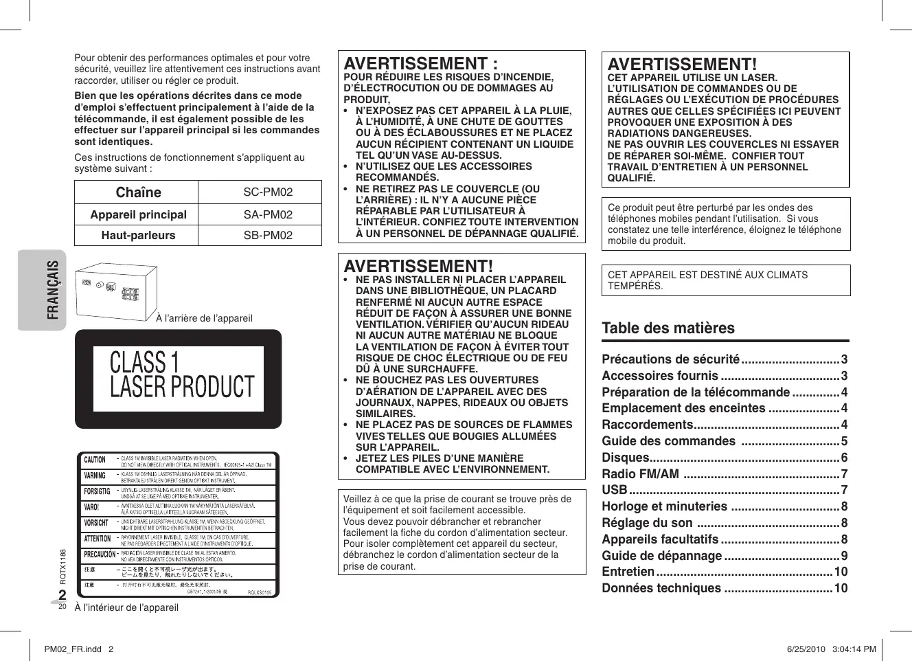 6/28/2010 11:50:56 AM DEUTSCH Pour obtenir des performances optimales et pour votre sécurité, veuillez lire attentivement ces instructions avant raccorder, utiliser ou régler ce produit. Bien que les opérations décrites dans ce mode d’emploi s’effectuent principalement à l’aide de la télécommande, il est également possible de les effectuer sur l’appareil principal si les commandes sont identiques. Ces instructions de fonctionnement s’appliquent au système suivant : SC-PM02 Appareil principal SA-PM02 Haut-parleurs SB-PM02 FRANÇAIS Chaîne POUR RÉDUIRE LES RISQUES D’INCENDIE,
