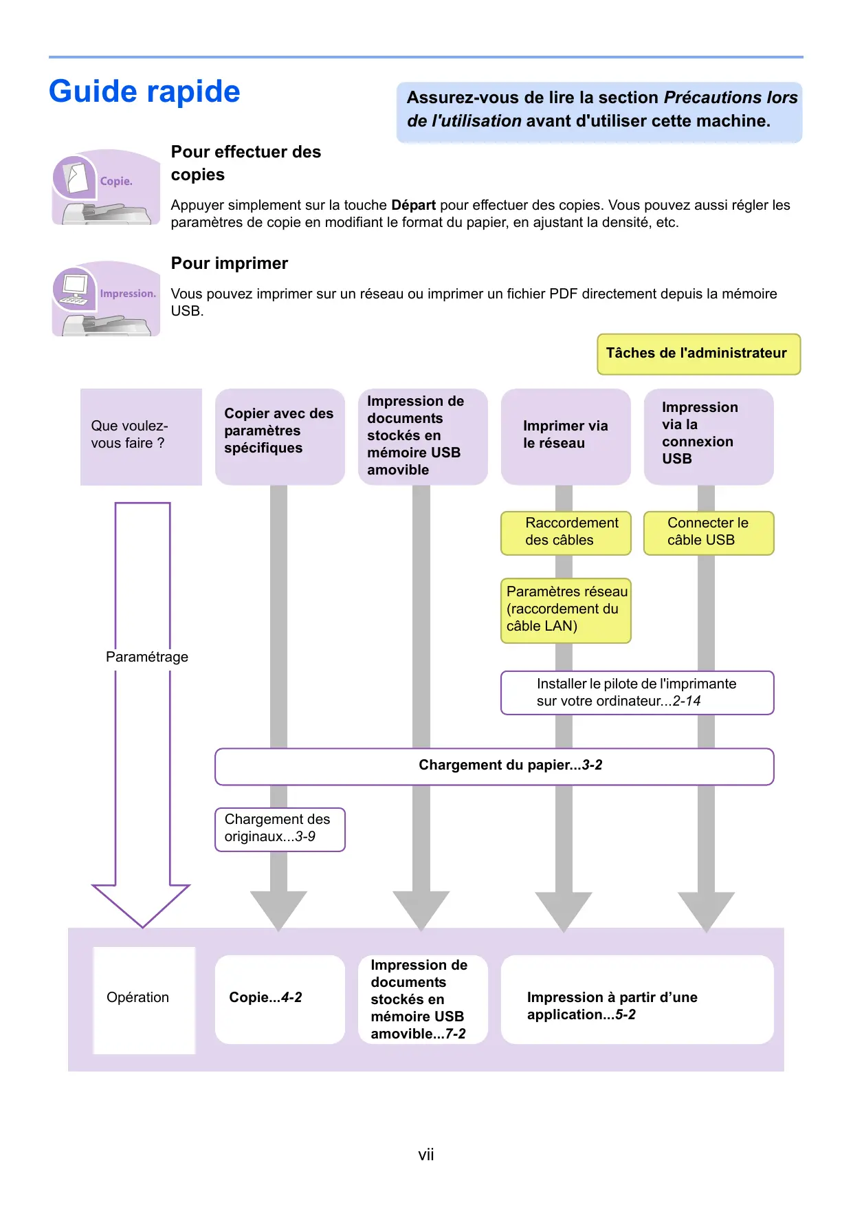 Vous pouvez imprimer sur un réseau ou imprimer un fichier PDF directement depuis la mémoire USB. Tâches de l'administrateur