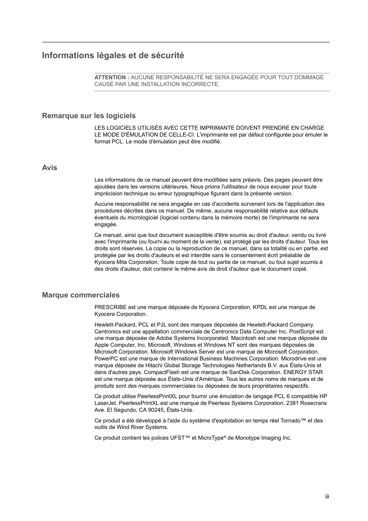 Informations légales et de sécurité ATTENTION : AUCUNE RESPONSABILITÉ NE SERA ENGAGÉE POUR TOUT DOMMAGE CAUSÉ PAR UNE INSTALLATION INCORRECTE. Remarque sur les logiciels LES LOGICIELS UTILISÉS AVEC CETTE IMPRIMANTE DOIVENT PRENDRE EN CHARGE LE MODE D'ÉMULATION DE CELLE-CI. L'imprimante est par défaut configurée pour émuler le format PCL. Le mode d'émulation peut être modifié. Avis Les informations de ce manuel peuvent être modifiées sans préavis. Des pages peuvent être ajoutées dans les versions ultérieures. Nous prions l'utilisateur de nous excuser pour toute imprécision technique ou erreur typographique figurant dans la présente version. Aucune responsabilité ne sera engagée en cas d'accidents survenant lors de l'application des procédures décrites dans ce manuel. De même, aucune responsabilité relative aux défauts éventuels du micrologiciel (logiciel contenu dans la mémoire morte) de l'imprimante ne sera engagée. Ce manuel, ainsi que tout document susceptible d'être soumis au droit d'auteur, vendu ou livré avec l'imprimante (ou fourni au moment de la vente), est protégé par les droits d'auteur. Tous les droits sont réservés. La copie ou la reproduction de ce manuel, dans sa totalité ou en partie, est protégée par les droits d'auteurs et est interdite sans le consentement écrit préalable de Kyocera Mita Corporation. Toute copie de tout ou partie de ce manuel, ou tout sujet soumis à des droits d'auteur, doit contenir le même avis de droit d'auteur que le document copié. Marque commerciales PRESCRIBE est une marque déposée de Kyocera Corporation. KPDL est une marque de Kyocera Corporation. Hewlett-Packard, PCL et PJL sont des marques déposées de Hewlett-Packard Company. Centronics est une appellation commerciale de Centronics Data Computer Inc. PostScript est une marque déposée de Adobe Systems Incorporated. Macintosh est une marque déposée de Apple Computer, Inc. Microsoft, Windows et Windows NT sont des marques déposées de Microsoft Corporation. Microsoft Windows Server est une marque de Microsoft Corporation. PowerPC est une marque de International Business Machines Corporation. Microdrive est une marque déposée de Hitachi Global Storage Technologies Netherlands B.V. aux États-Unis et dans d'autres pays. CompactFlash est une marque de SanDisk Corporation. ENERGY STAR est une marque déposée aux États-Unis d'Amérique. Tous les autres noms de marques et de produits sont des marques commerciales ou déposées de leurs propriétaires respectifs. Ce produit utilise PeerlessPrintXL pour fournir une émulation de langage PCL 6 compatible HP LaserJet. PeerlessPrintXL est une marque de Peerless Systems Corporation, 2381 Rosecrans Ave. El Segundo, CA 90245, États-Unis. Ce produit a été développé à l'aide du système d'exploitation en temps réel Tornado™ et des outils de Wind River Systems. Ce produit contient les polices UFST™ et MicroType® de Monotype Imaging Inc. iii USB Ce produit a été certifié par le USB Implementers Forum, Inc. Conformité Informations de sécurité Avis relatif au rayonnement laser