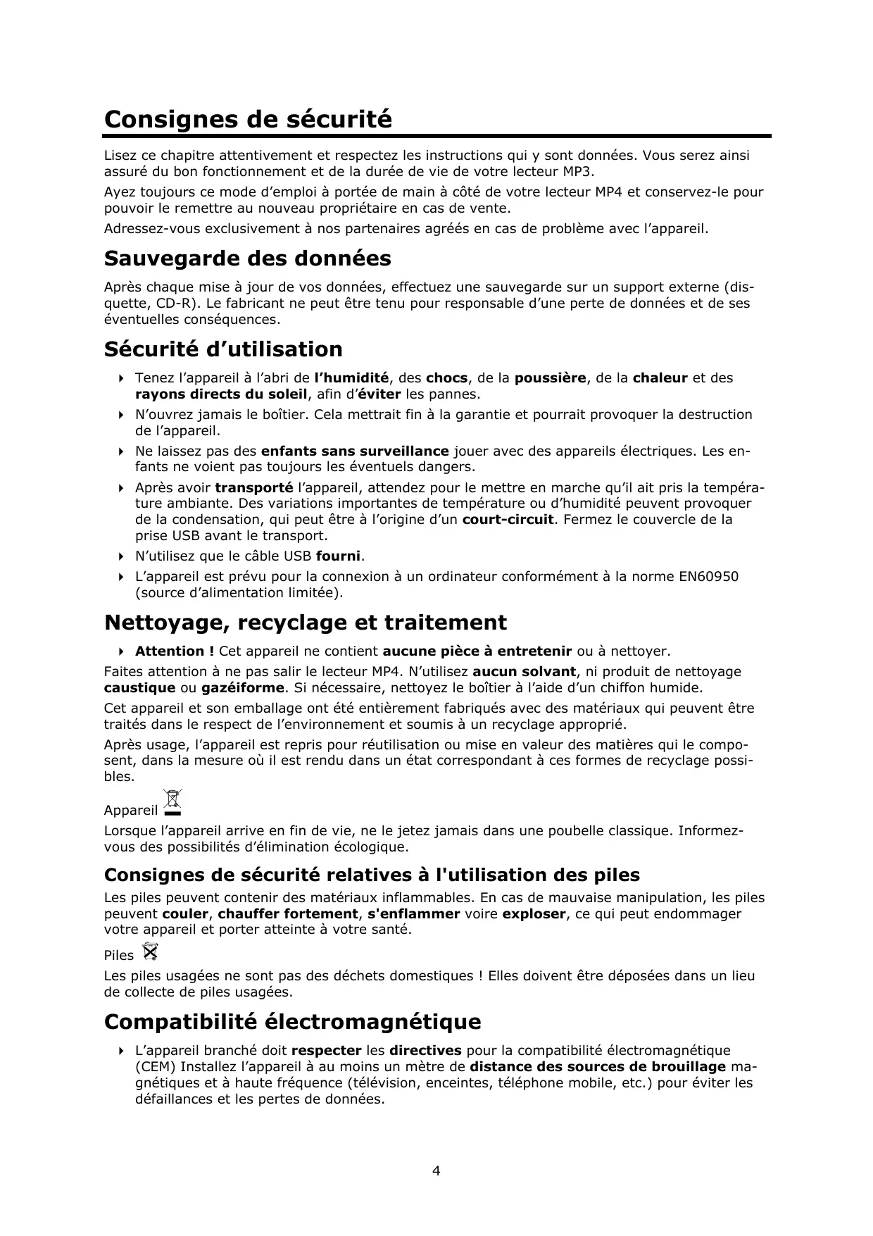 Consignes de sécurité Lisez ce chapitre attentivement et respectez les instructions qui y sont données. Vous serez ainsi assuré du bon fonctionnement et de la durée de vie de votre lecteur MP3. Ayez toujours ce mode d’emploi à portée de main à côté de votre lecteur MP4 et conservez-le pour pouvoir le remettre au nouveau propriétaire en cas de vente. Adressez-vous exclusivement à nos partenaires agréés en cas de problème avec l’appareil. Sauvegarde des données Après chaque mise à jour de vos données, effectuez une sauvegarde sur un support externe (disquette, CD-R). Le fabricant ne peut être tenu pour responsable d’une perte de données et de ses éventuelles conséquences. Sécurité d’utilisation Tenez l’appareil à l’abri de l’humidité, des chocs, de la poussière, de la chaleur et des rayons directs du soleil, afin d’éviter les pannes. N’ouvrez jamais le boîtier. Cela mettrait fin à la garantie et pourrait provoquer la destruction de l’appareil. Ne laissez pas des enfants sans surveillance jouer avec des appareils électriques. Les enfants ne voient pas toujours les éventuels dangers. Après avoir transporté l’appareil, attendez pour le mettre en marche qu’il ait pris la température ambiante. Des variations importantes de température ou d’humidité peuvent provoquer de la condensation, qui peut être à l’origine d’un court-circuit. Fermez le couvercle de la prise USB avant le transport. N’utilisez que le câble USB fourni. L’appareil est prévu pour la connexion à un ordinateur conformément à la norme EN60950 (source d’alimentation limitée). Nettoyage, recyclage et traitement Attention ! Cet appareil ne contient aucune pièce à entretenir ou à nettoyer. Faites attention à ne pas salir le lecteur MP4. N’utilisez aucun solvant, ni produit de nettoyage caustique ou gazéiforme. Si nécessaire, nettoyez le boîtier à l’aide d’un chiffon humide. Cet appareil et son emballage ont été entièrement fabriqués avec des matériaux qui peuvent être traités dans le respect de l’environnement et soumis à un recyclage approprié. Après usage, l’appareil est repris pour réutilisation ou mise en valeur des matières qui le composent, dans la mesure où il est rendu dans un état correspondant à ces formes de recyclage possibles. Appareil Lorsque l’appareil arrive en fin de vie, ne le jetez jamais dans une poubelle classique. Informezvous des possibilités d’élimination écologique. Consignes de sécurité relatives à l'utilisation des piles Les piles peuvent contenir des matériaux inflammables. En cas de mauvaise manipulation, les piles peuvent couler, chauffer fortement, s'enflammer voire exploser, ce qui peut endommager votre appareil et porter atteinte à votre santé. Piles Les piles usagées ne sont pas des déchets domestiques ! Elles doivent être déposées dans un lieu de collecte de piles usagées. Compatibilité électromagnétique L’appareil branché doit respecter les directives pour la compatibilité électromagnétique (CEM) Installez l’appareil à au moins un mètre de distance des sources de brouillage magnétiques et à haute fréquence (télévision, enceintes, téléphone mobile, etc.) pour éviter les défaillances et les pertes de données.