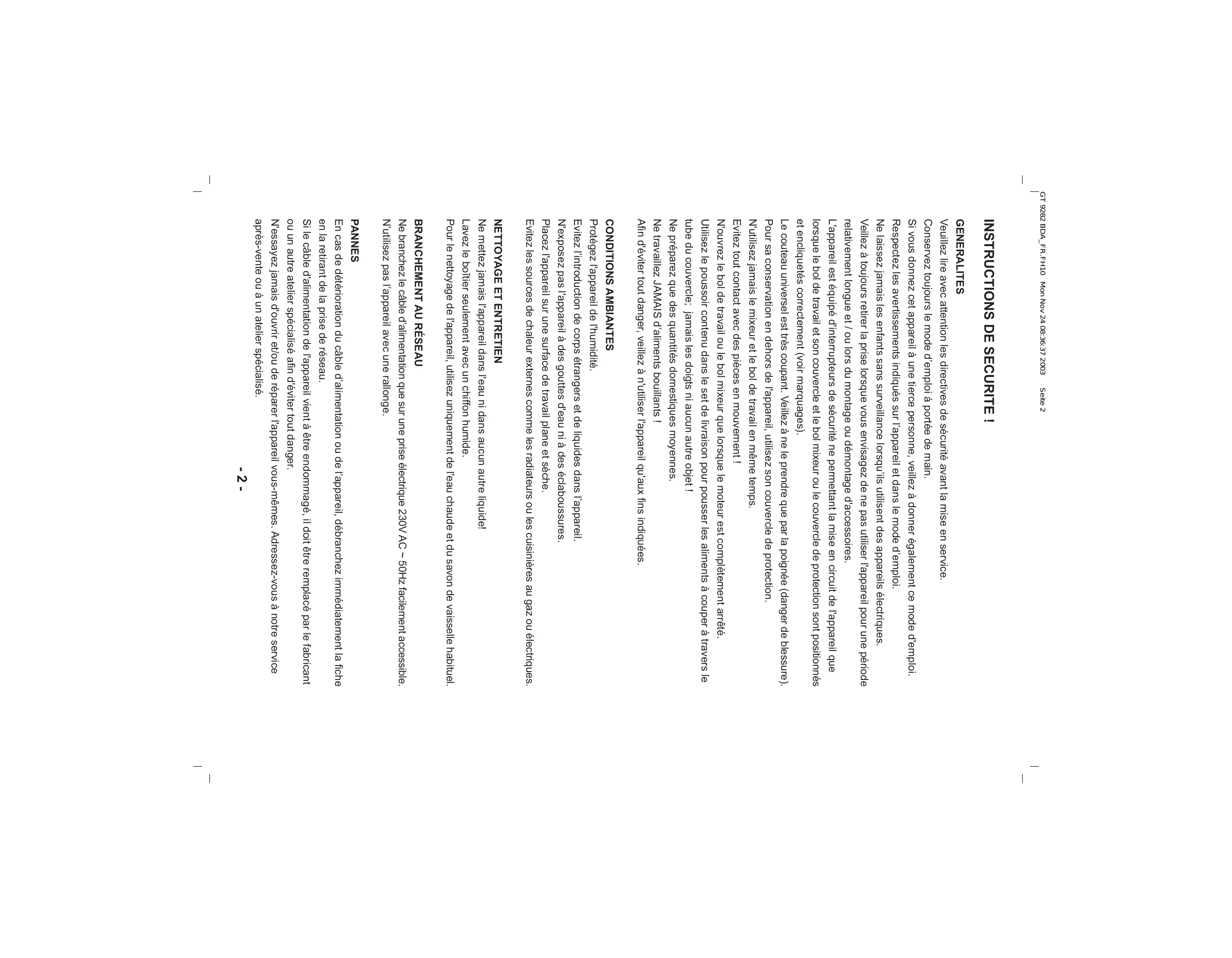 GT 9282 MODE D'EMPLOI 02/04 ZAC de La Bertraie Route de Sablé 72270 Villaines sous Malicorne PRODUCT SERVICE geprüfte Sicherheit GT 9282 BDA_FR.FH10 Mon Nov 24 08:36:37 2003 Seite 2 INSTRUCTIONS DE SECURITE ! GENERALITES Veuillez lire avec attention les directives de sécurité avant la mise en service. Conservez toujours le mode demploi à portée de main. Si vous donnez cet appareil à une tierce personne, veillez à donner également ce mode d'emploi. Respectez les avertissements indiqués sur lappareil et dans le mode demploi. Ne laissez jamais les enfants sans surveillance lorsquils utilisent des appareils électriques. Veillez à toujours retirer la prise lorsque vous envisagez de ne pas utiliser l'appareil pour une période relativement longue et / ou lors du montage ou démontage d'accessoires. L'appareil est équipé d'interrupteurs de sécurité ne permettant la mise en circuit de l'appareil que lorsque le bol de travail et son couvercle et le bol mixeur ou le couvercle de protection sont positionnés et encliquetés correctement (voir marquages). Le couteau universel est très coupant. Veillez à ne le prendre que par la poignée (danger de blessure). Pour sa conservation en dehors de l'appareil, utilisez son couvercle de protection. N'utilisez jamais le mixeur et le bol de travail en même temps. Evitez tout contact avec des pièces en mouvement ! N'ouvrez le bol de travail ou le bol mixeur que lorsque le moteur est complètement arrêté. Utilisez le poussoir contenu dans le set de livraison pour pousser les aliments à couper à travers le tube du couvercle; jamais les doigts ni aucun autre objet ! Ne préparez que des quantités domestiques moyennes. Ne travaillez JAMAIS daliments bouillants ! Afin d'éviter tout danger, veillez à n'utiliser l'appareil qu'aux fins indiquées. CONDITIONS AMBIANTES Protégez l'appareil de l'humidité. Evitez lintroduction de corps étrangers et de liquides dans lappareil. N'exposez pas l'appareil à des gouttes d'eau ni à des éclaboussures. Placez l'appareil sur une surface de travail plane et sèche. Evitez les sources de chaleur externes comme les radiateurs ou les cuisinières au gaz ou électriques.