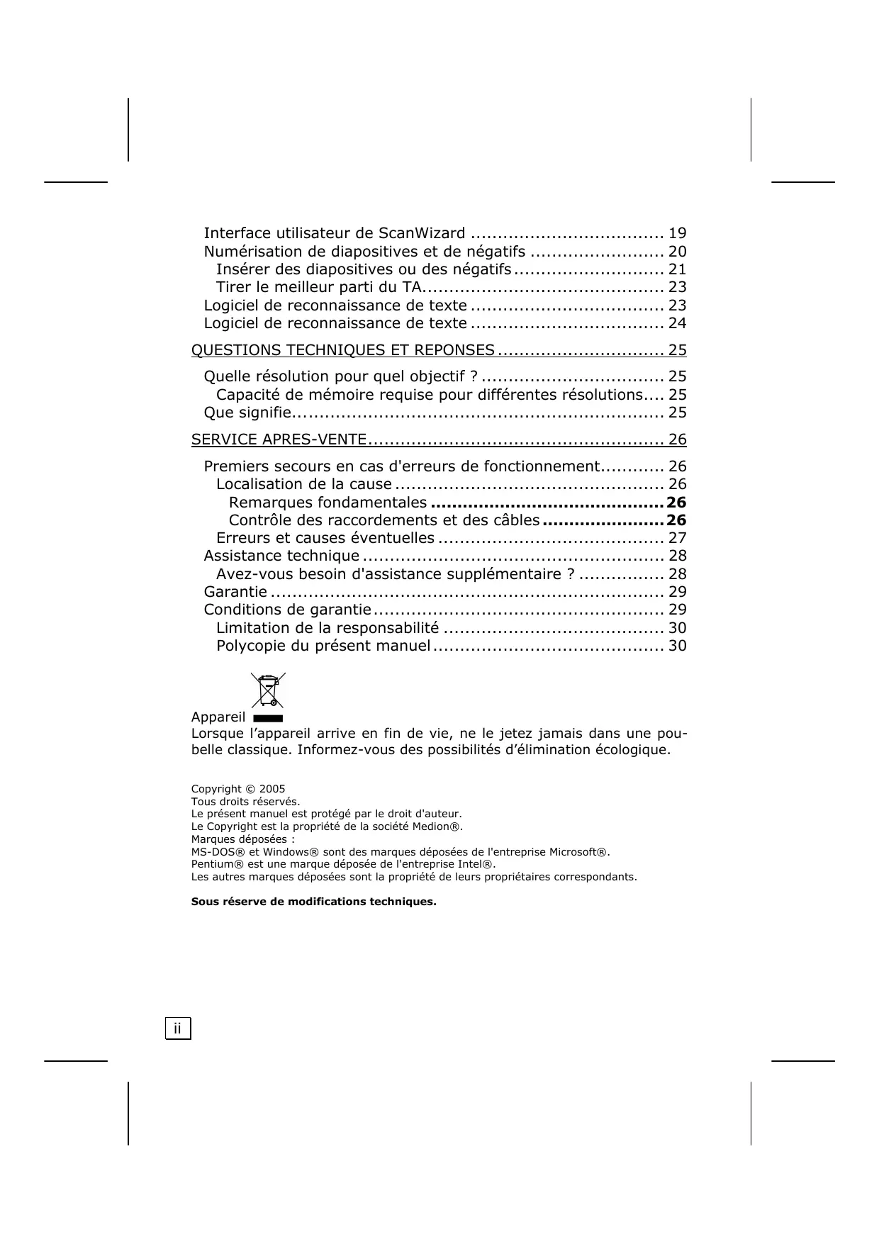 - Polycopie du présent manuel Appareil Lorsque l’appareil arrive en fin de vie, ne le jetez jamais dans une poubelle classique. Informez-vous des possibilités d’élimination écologique. Copyright © 2005 Tous droits réservés. Le présent manuel est protégé par le droit d'auteur. Le Copyright est la propriété de la société Medion®. Marques déposées : MS-DOS® et Windows® sont des marques déposées de l'entreprise Microsoft®. Pentium® est une marque déposée de l'entreprise Intel®. Les autres marques déposées sont la propriété de leurs propriétaires correspondants. Sous réserve de modifications techniques. p. 30