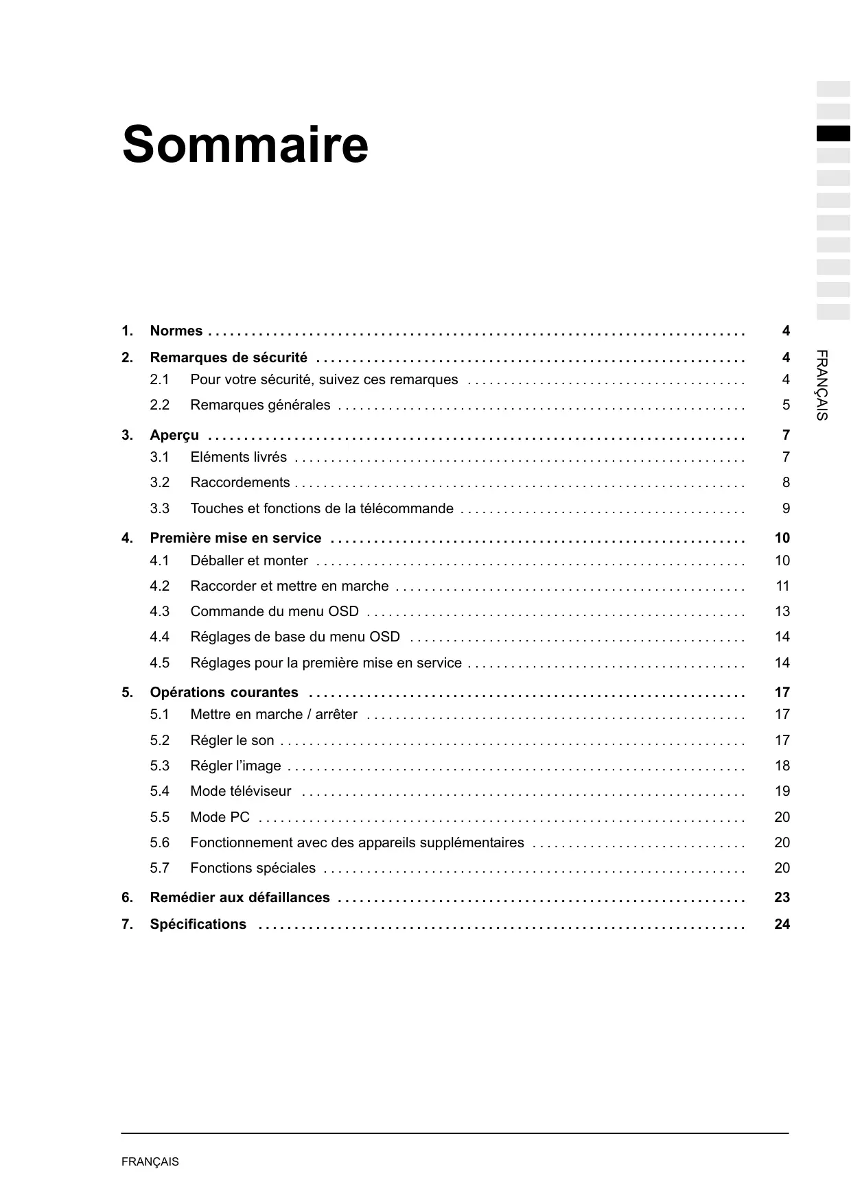 Normes Le présent écran est une installation de technique d'information et répond aux directives et normes suivantes de l'Union européenne : 89/336/CEE du 3 mai 1989 et modifications suivantes (Directive 92/31/CEE d'avril 1992 et Directive 93/68/CEE du 22 juillet 1993) 73/23/CEE du 19 février 1973 et modifications suivantes (Directive 93/68/CEE du 22 juillet 1993) EN55013, EN55020, EN61000-3-2/-3 (Compatibilité électromagnétique) EN60065 (Exigences de sécurité). La conformité avec les exigences est certifiée par le marquage apposé sur le produit. Le fabricant ne peut pas être tenu pour responsable d'opérations effectuées non prévues dans le cadre des conditions d'opération, comme elles sont décrites dans ces instructions de service. En outre, dans un tel cas, la garantie applicable au produit et la responsabilité prennent fin.