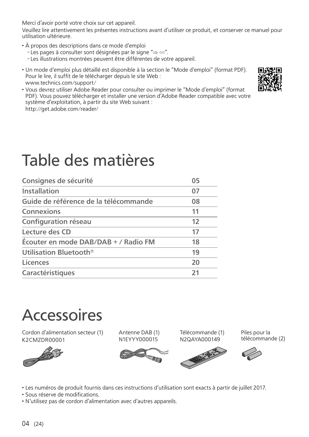 Merci d’avoir porté votre choix sur cet appareil. Veuillez lire attentivement les présentes instructions avant d’utiliser ce produit, et conserver ce manuel pour utilisation ultérieure. • À propos des descriptions dans ce mode d’emploi - Les pages à consulter sont désignées par le signe “ ○○”. - Les illustrations montrées peuvent être différentes de votre appareil. • Un mode d’emploi plus détaillé est disponible à la section le “Mode d’emploi” (format PDF). Pour le lire, il suffit de le télécharger depuis le site Web : www.technics.com/support/ • Vous devrez utiliser Adobe Reader pour consulter ou imprimer le “Mode d’emploi” (format PDF). Vous pouvez télécharger et installer une version d’Adobe Reader compatible avec votre système d’exploitation, à partir du site Web suivant : http://get.adobe.com/reader/