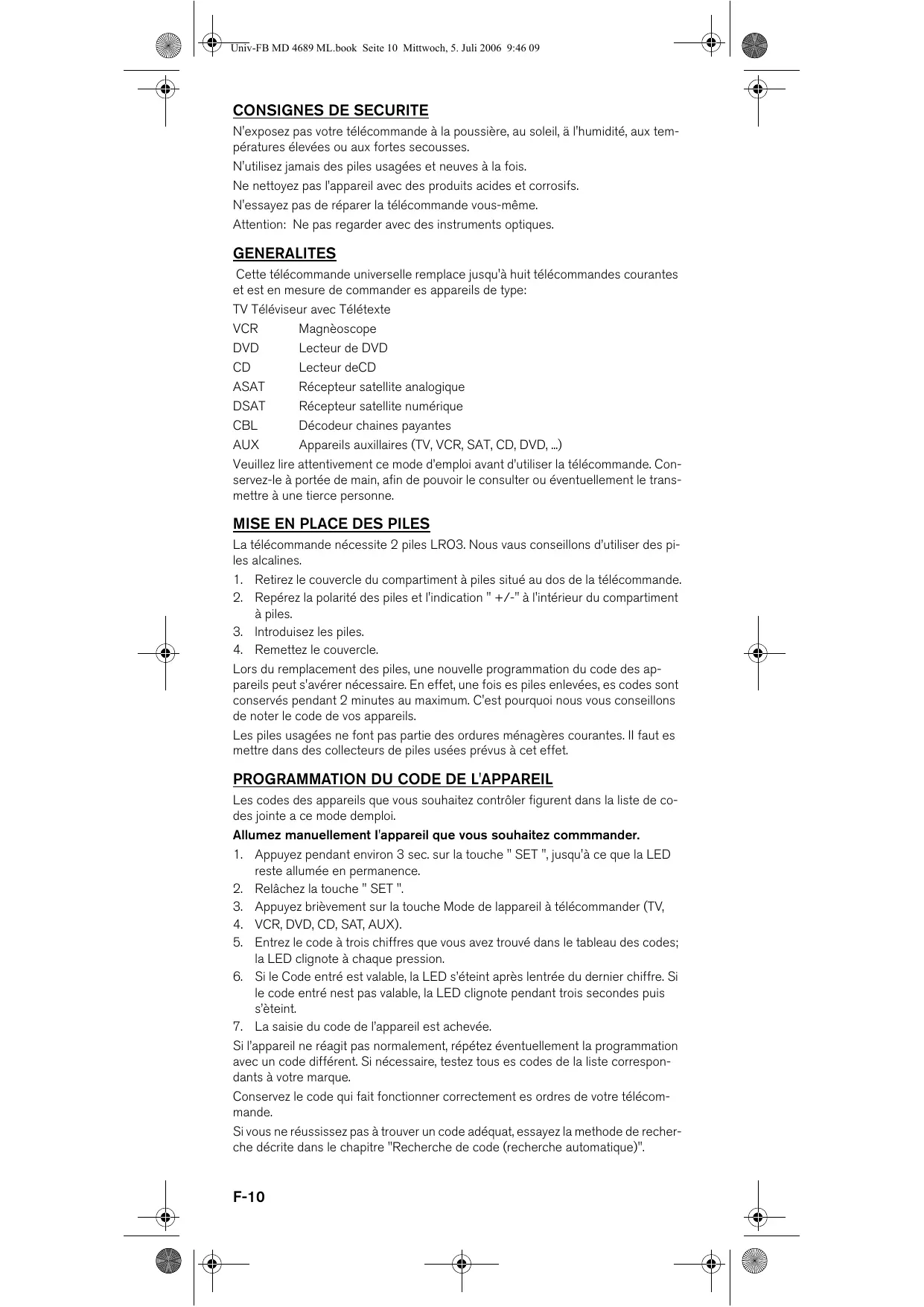F CONSIGNES DE SECURITE N'exposez pas votre télécommande à la poussière, au soleil, ä l'humidité, aux températures élevées ou aux fortes secousses.