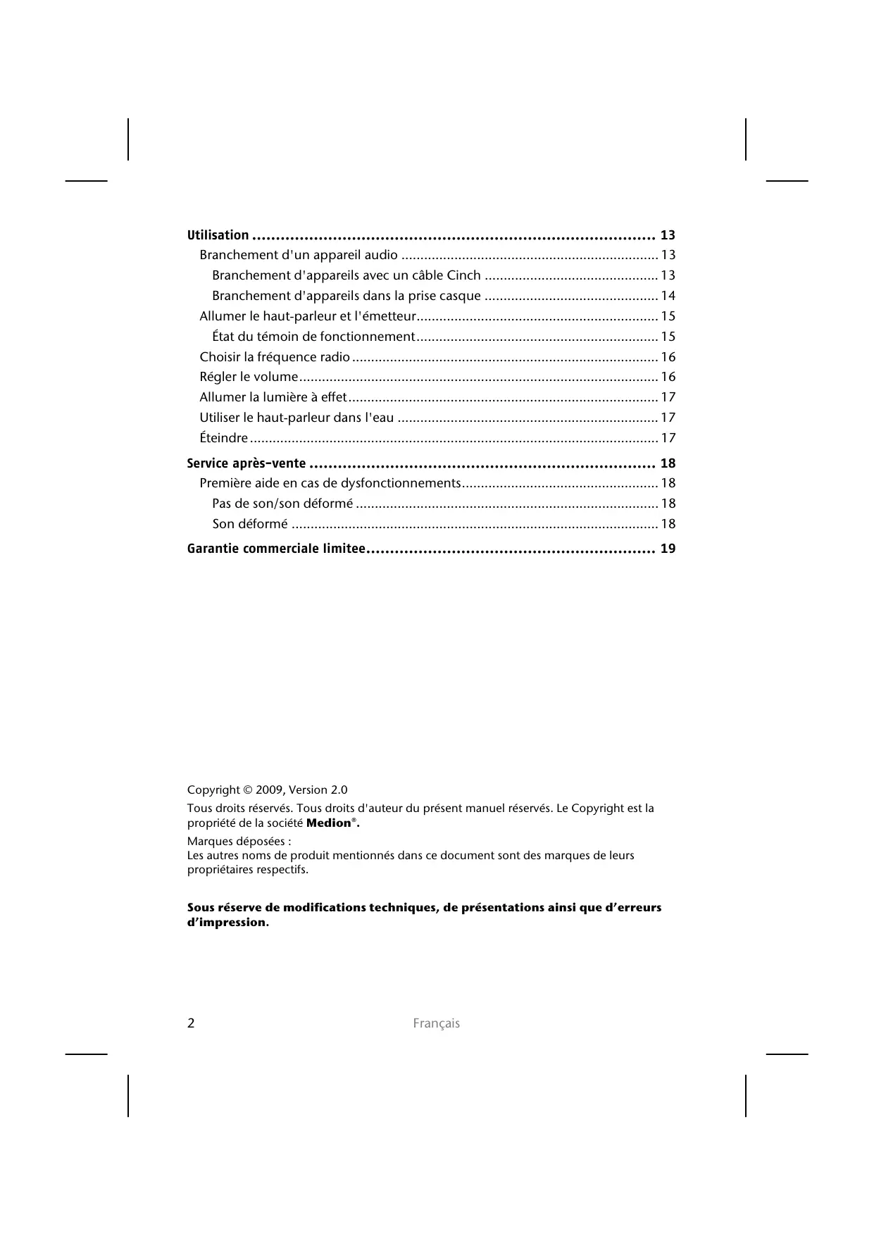 Choisir la fréquence radio 16 Réglé le volume. 16 Allumer la lumière à effet. 17 Utiliser le haut-parleur dans l'eau 17 Éteindre 17