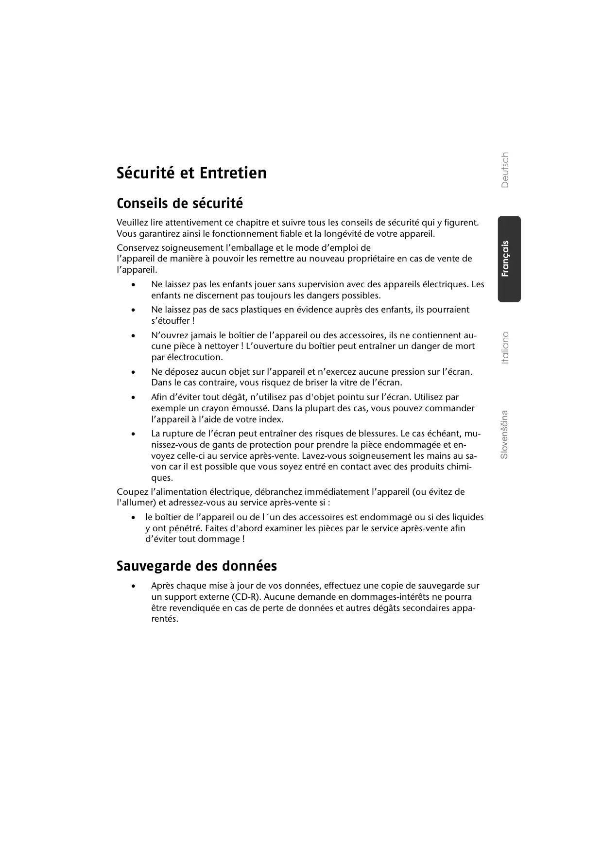 Après chaque mise à jour de vos données, effectuez une copie de sauvegarde sur un support externe (CD-R). Aucune demande en dommages-intérêts ne pourra être revendiquée en cas de perte de données et autres dégâts secondaires apparentés. Italiano