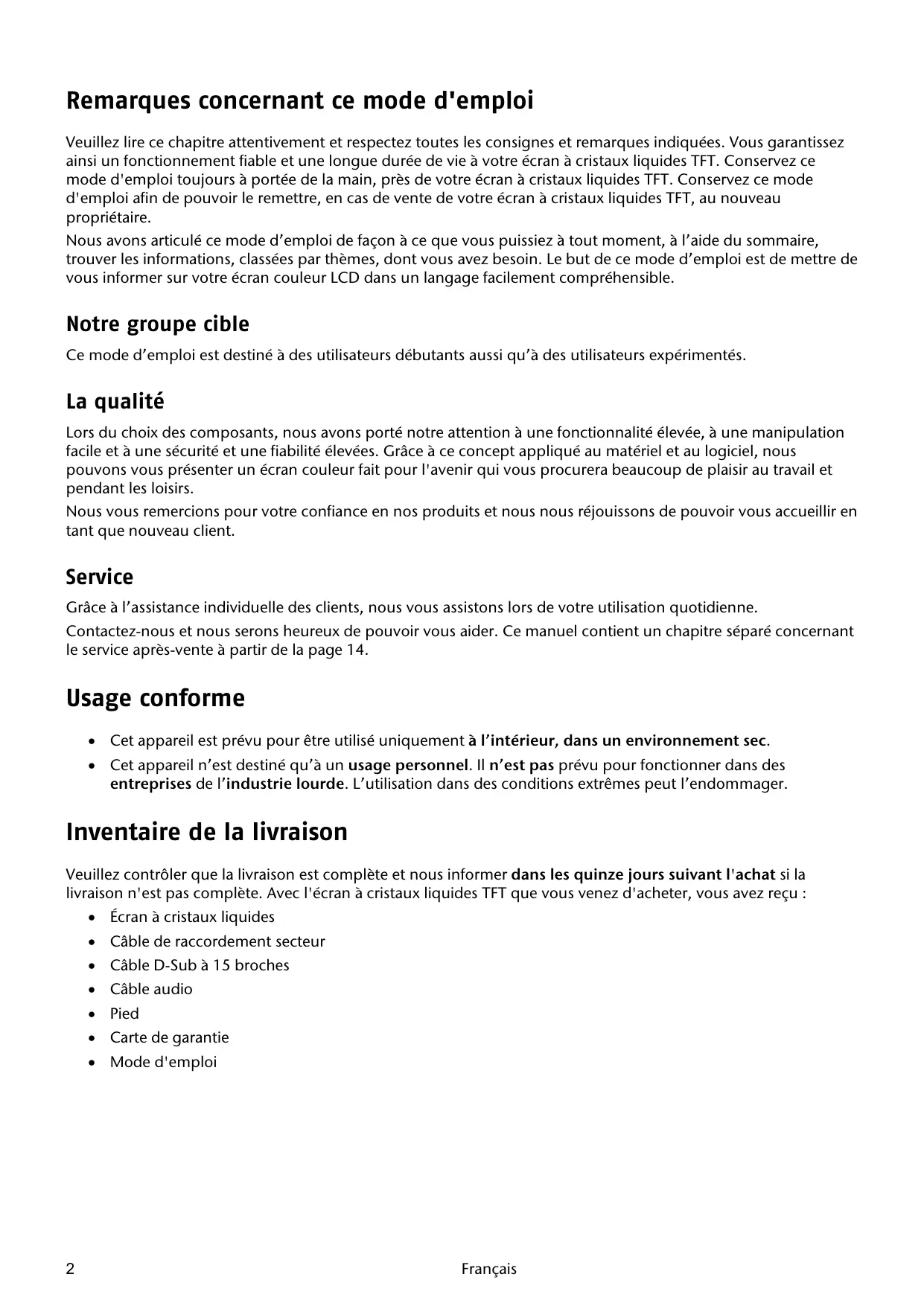 Veuillez contrôler que la livraison est complète et nous informer dans les quinze jours suivant l'achat si la livraison n'est pas complète. Avec l'écran à cristaux liquides TFT que vous venez d'acheter, vous avez reçu : Écran à cristaux liquides Câble de raccordement secteur Câble D-Sub à 15 broches Câble audio Pied Carte de garantie Mode d'emploi