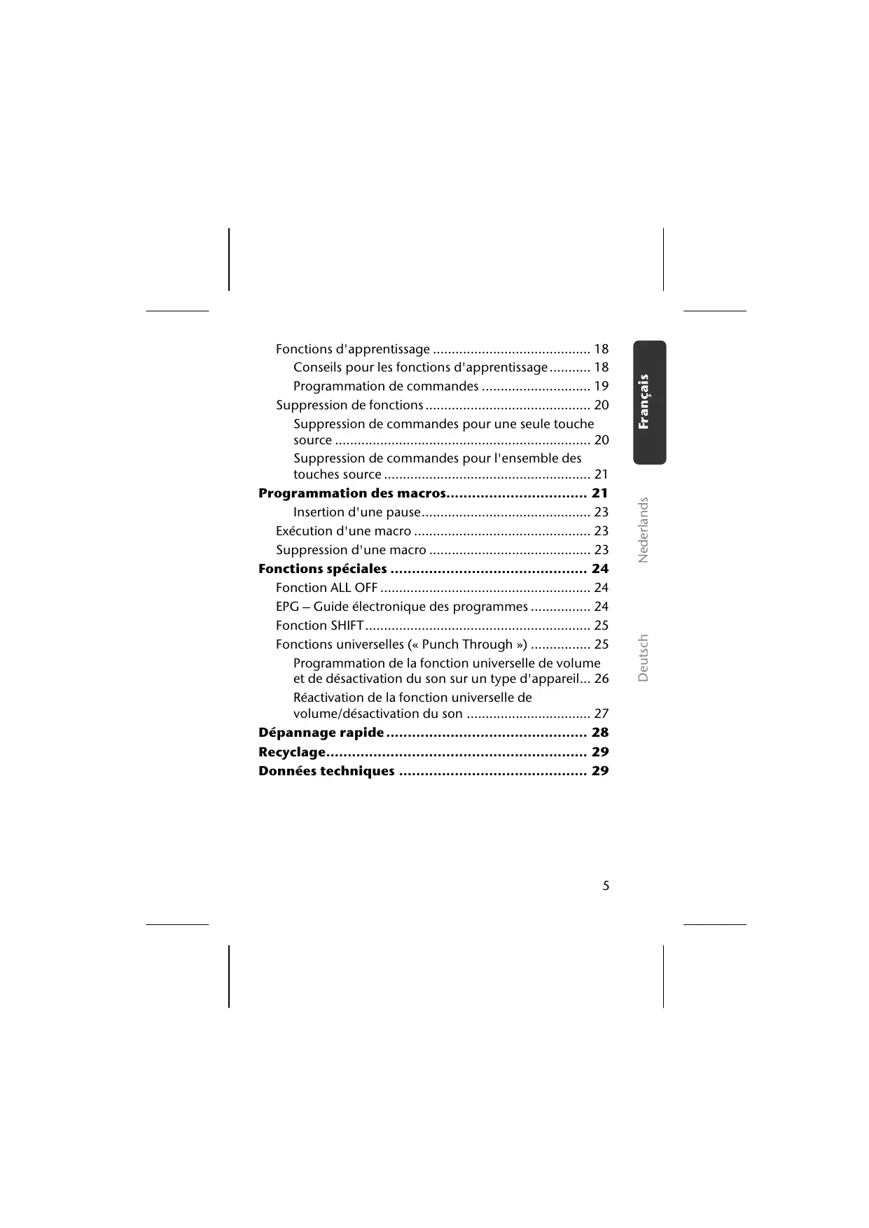 Français Nederlands Deutsch programmées avec des codes d'appareils d'autres marques de téléviseurs pour réaliser les fonctions de base du téléviseur (volume, désactivation du son, recherche des chaînes). N'essayez pas de transférer sur votre télécommande universelle les fonctions d'une télécommande d'origine qui a été programmée à son tour avec le code d'un autre téléviseur. Cela peut provoquer des erreurs lors de la programmation.