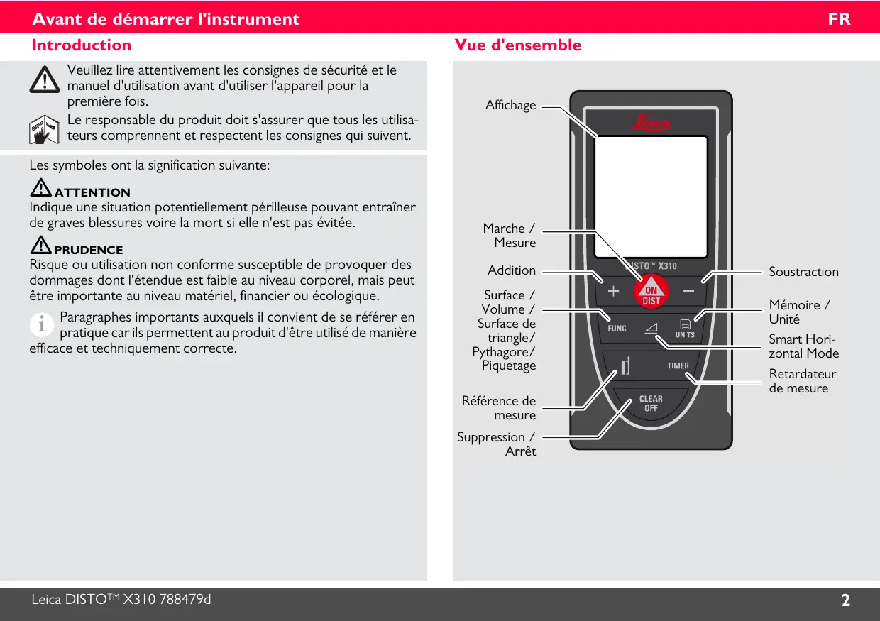 Marche / Mesure Addition Surface / Volume / Surface de triangle/ Pythagore/ Piquetage Soustraction Mémoire / Unité Smart Horizontal Mode Retardateur de mesure Référence de mesure Suppression / Arrêt Leica DISTOTM X310 788479d