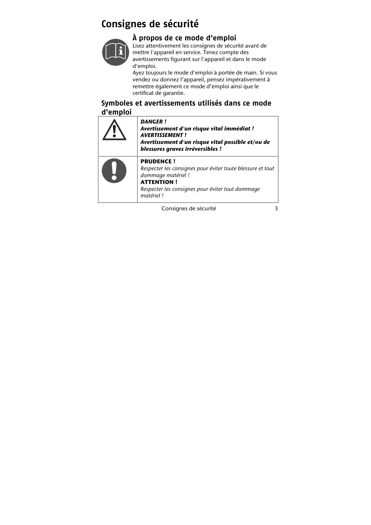 Consignes de sécurité À propos de ce mode d'emploi Lisez attentivement les consignes de sécurité avant de mettre l'appareil en service. Tenez compte des avertissements figurant sur l'appareil et dans le mode d'emploi. Ayez toujours le mode d'emploi à portée de main. Si vous vendez ou donnez l’appareil, pensez impérativement à remettre également ce mode d’emploi ainsi que le certificat de garantie. Symboles et avertissements utilisés dans ce mode d'emploi DANGER ! Avertissement d'un risque vital immédiat ! AVERTISSEMENT ! Avertissement d'un risque vital possible et/ou de blessures graves irréversibles ! PRUDENCE ! Respecter les consignes pour éviter toute blessure et tout dommage matériel ! ATTENTION ! Respecter les consignes pour éviter tout dommage matériel ! Consignes de sécurité