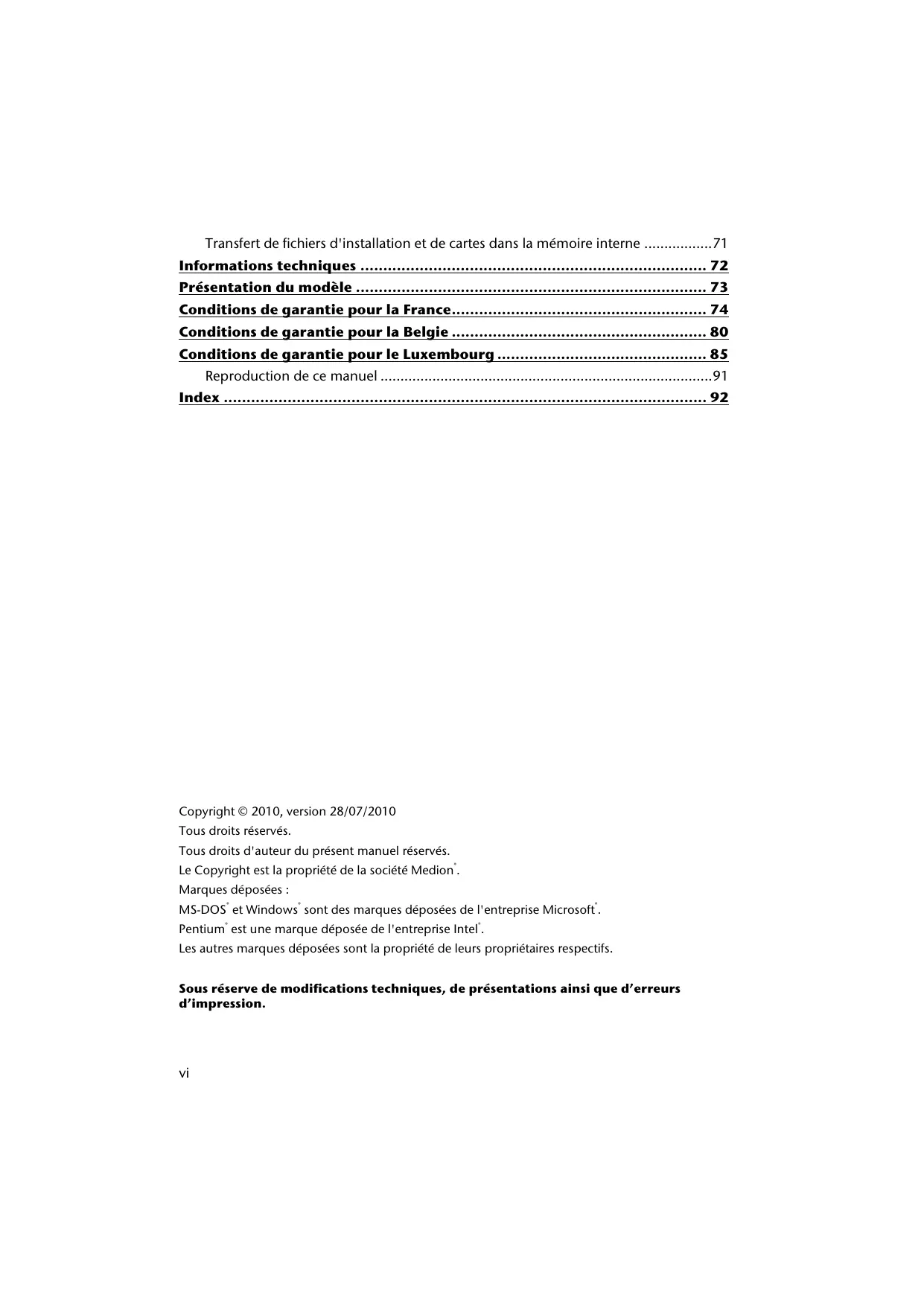 Transfert de fichiers d'installation et de cartes dans la mémoire interne 71 Informations techniques 72 Présentation du modèle 73 Conditions de garantie pour la France 74 Conditions de garantie pour la Belgie 80 Conditions de garantie pour le Luxembourg 85 Reproduction de ce manuel 91 Index 92
