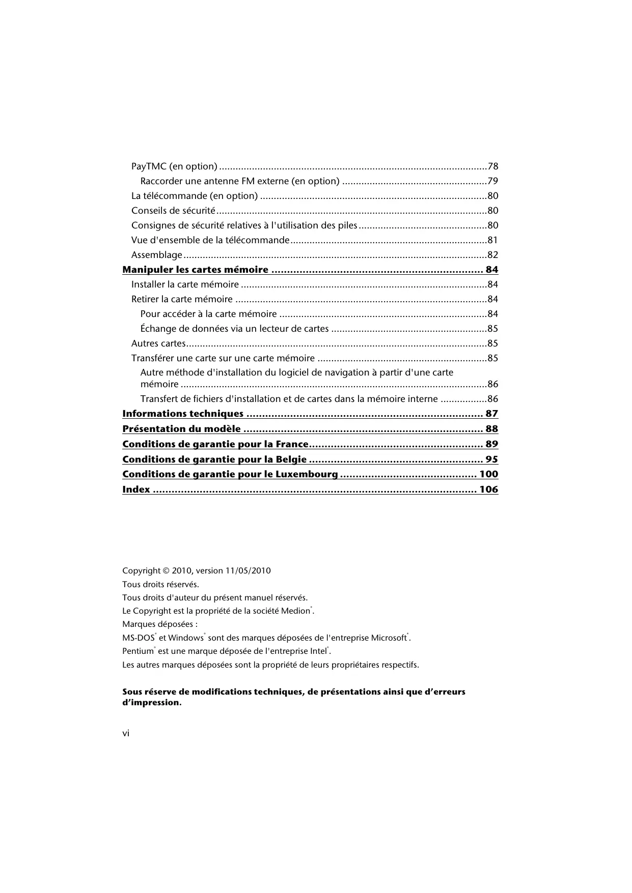 PayTMC (en option) 78 Raccorder une antenne FM externe (en option) 79 La télécommande (en option) 80 Conseils de sécurité80 Consignes de sécurité relatives à l'utilisation des piles 80 Vue d'ensemble de la télécommande81 Assemblage 82 Manipuler les cartes mémoire 84 Installer la carte mémoire 84 Retirer la carte mémoire 84 Pour accéder à la carte mémoire 84 Échange de données via un lecteur de cartes 85 Autres cartes85 Transférer une carte sur une carte mémoire 85 Autre méthode d'installation du logiciel de navigation à partir d'une carte mémoire 86 Transfert de fichiers d'installation et de cartes dans la mémoire interne 86 Informations techniques 87 Présentation du modèle 88 Conditions de garantie pour la France 89 Conditions de garantie pour la Belgie 95 Conditions de garantie pour le Luxembourg 100 Index 106