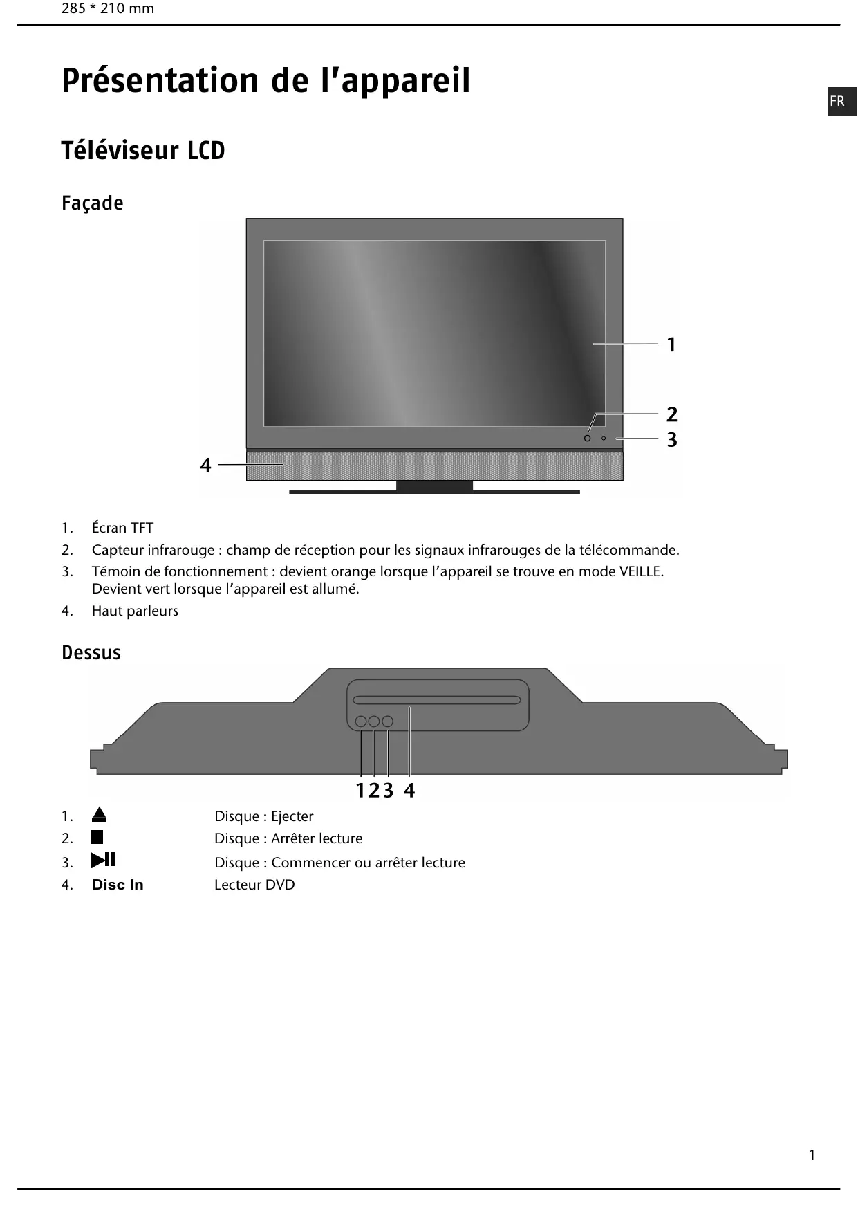 Sommaire Présentation de l’appareil 1 Téléviseur LCD 1 Télécommande 4 Sommaire 6 Remarques concernant le présent mode d'emploi 8 Usage conforme 8 Full HD 8 Inventaire de la livraison 8 Consignes de sécurité 9 Sécurité de fonctionnement 9 Lieu d’installation 9 Réparation 10 Environnement prévu 10 Alimentation en courant 10 Le lecteur DVD 10 Manipulation des piles 11 Normes/compatibilité électromagnétique 11 Télécommande universelle 12 Utilisation 12 Programmation de codes d’appareils 12 Saisie d’un code d’appareil en fonction de la liste des codes 12 Recherche manuelle du code 12 Recherche automatique du code 13 Cycle d’une seconde ou de trois secondes 13 Recherche de code à partir de la marque 13 Identification du code 14 Fonctionnement normal 14 Utiliser un seul appareil 14 Fonction ÉTEINDRE TOUT 14 EPG – Guide électronique des programmes 14 Mise en marche 15 Déballage 15 Insertion des piles dans la télécommande 15 Raccordement à une antenne 15 Mode DVB-T 15 Brancher l’antenne DVB-T 15 Raccordement à l’alimentation 15 Mise en marche et arrêt du téléviseur LCD 16 Lors la première mise en marche 16 Sélection d’un programme 16 Réglages du son 16 Réglages de l’image 17 Affichage d’informations 17 Ouverture de la liste des favoris 17 Sélection d’un appareil externe 17