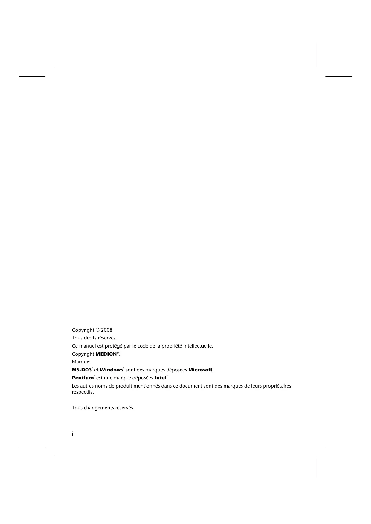 Copyright © 2008 Tous droits réservés. Ce manuel est protégé par le code de la propriété intellectuelle. Copyright MEDION®. Marque: