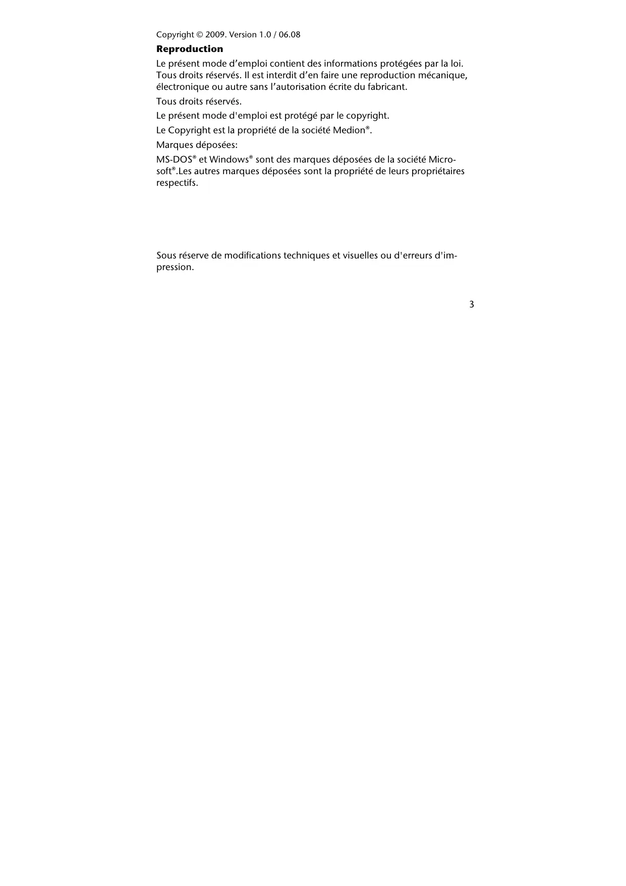 Copyright © 2009. Version 1.0 / 06.08 Reproduction Le présent mode d'emploi contient des informations protégées par la loi. Tous droits réservés. Il est interdit d’en faire une reproduction mécanique, électronique ou autre sans l’autorisation écrite du fabricant. Tous droits réservés. Le présent mode d'emploi est protégé par le copyright. Le Copyright est la propriété de la société Medion®. Marques déposées: MS-DOS” et Windows” sont des marques déposées de la société Micro- soft”.Les autres marques déposées sont la propriété de leurs propriétaires respectifs. Sous réserve de modifications techniques et visuelles ou d'erreurs d'im- pression.