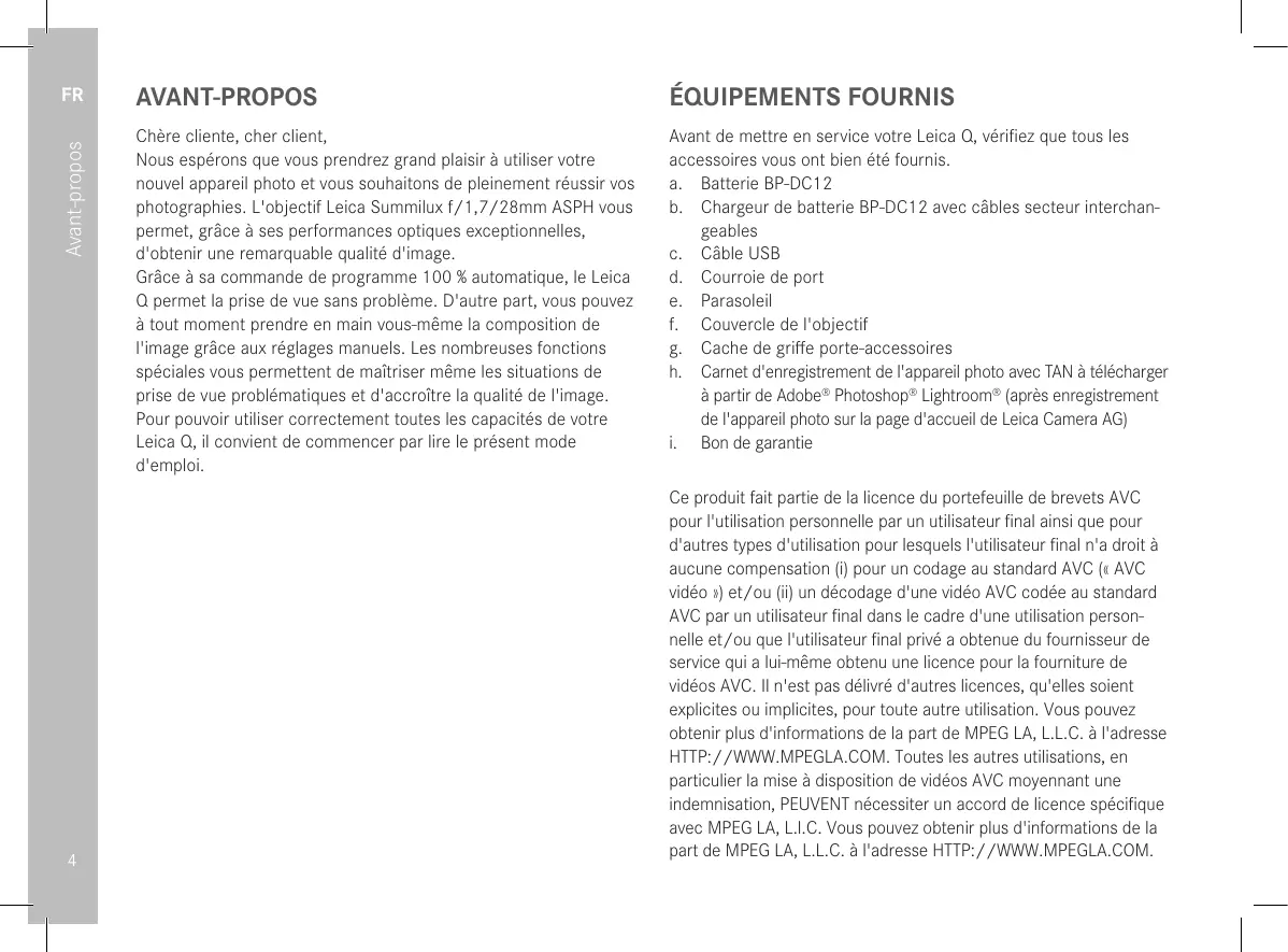 à partir de Adobe® Photoshop® Lightroom® (après enregistrement de l'appareil photo sur la page d'accueil de Leica Camera AG) i. Bon de garantie Ce produit fait partie de la licence du portefeuille de brevets AVC pour l'utilisation personnelle par un utilisateur final ainsi que pour d'autres types d'utilisation pour lesquels l'utilisateur final n'a droit à aucune compensation (i) pour un codage au standard AVC (« AVC vidéo ») et/ou (ii) un décodage d'une vidéo AVC codée au standard AVC par un utilisateur final dans le cadre d'une utilisation personnelle et/ou que l'utilisateur final privé a obtenue du fournisseur de service qui a lui-même obtenu une licence pour la fourniture de vidéos AVC. Il n'est pas délivré d'autres licences, qu'elles soient explicites ou implicites, pour toute autre utilisation. Vous pouvez obtenir plus d'informations de la part de MPEG LA, L.L.C. à l'adresse HTTP://WWW.MPEGLA.COM. Toutes les autres utilisations, en particulier la mise à disposition de vidéos AVC moyennant une indemnisation, PEUVENT nécessiter un accord de licence spécifique avec MPEG LA, L.l.C. Vous pouvez obtenir plus d'informations de la part de MPEG LA, L.L.C. à l'adresse HTTP://WWW.MPEGLA.COM.