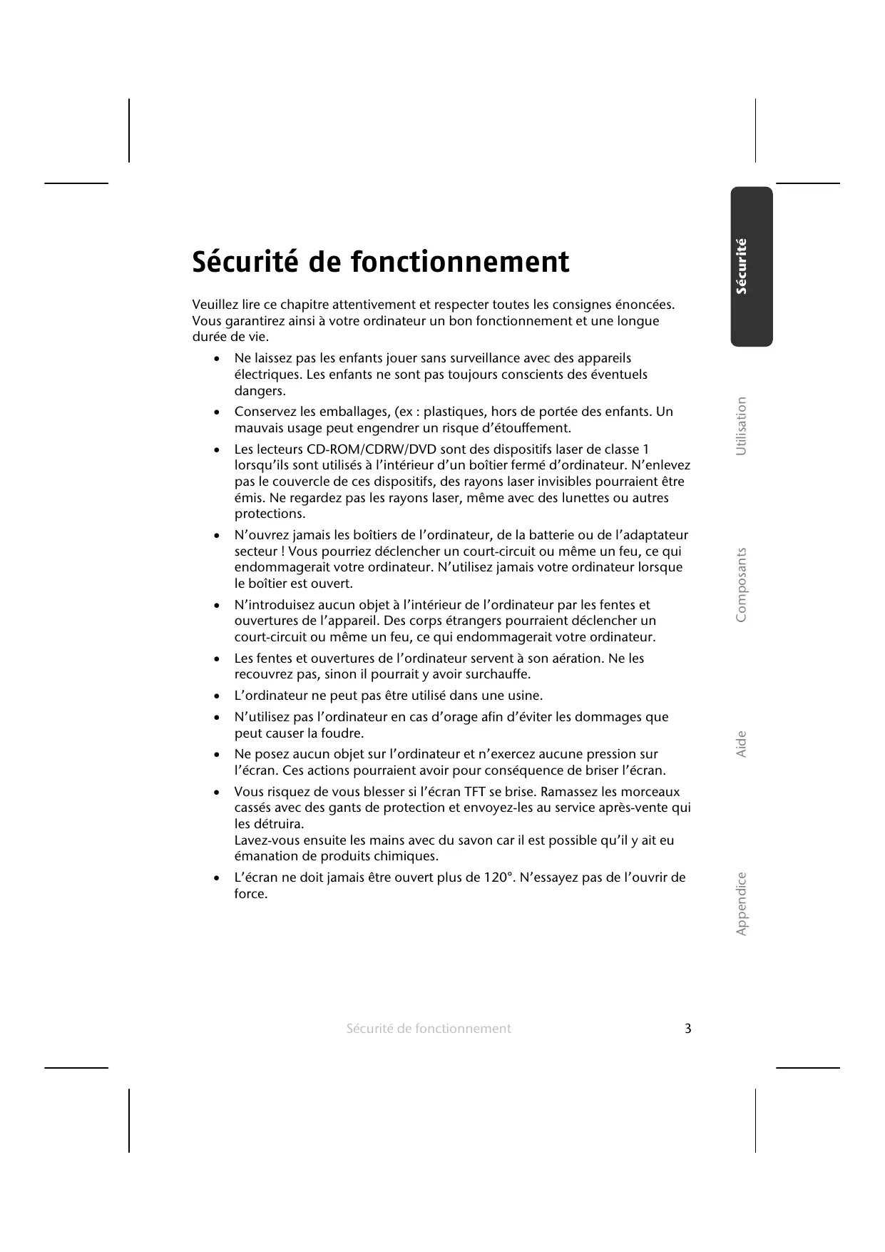 Lieu d'installation Maintenez votre ordinateur et tous les éléments qui lui sont connectés à l’abri de l’humidité et protégez-le de la poussière et des rayons de soleil. En cas de non-respect de ces consignes, vous exposez votre ordinateur à des risques de défaillances ou de détérioration. N'utilisez pas votre ordinateur à l’extérieur : selon les conditions météorologiques (ex : la pluie, la neige), vous risquez d’endommager l’appareil. Placez et utilisez tous les éléments sur un support stable, bien horizontal et non soumis à des vibrations, l'ordinateur ne risquera pas ainsi de tomber. N'utilisez pas le portable de manière prolongée sur vos genoux ou une autre partie de votre corps : la dissipation de chaleur sous l'appareil peut engendrer un échauffement désagréable. Durant les première heures d’utilisation, les nouveaux appareils peuvent dégager une odeur typique mais totalement inoffensive s’estompant progressivement au fil du temps. Pour combattre la formation d’odeur, nous vous conseillons d’aérer régulièrement la pièce. Lors du développement de ce produit, nous avons tout mis en œuvre pour que les taux restent largement inférieurs aux taux limites en vigueur. Environnement prévu L'ordinateur peut fonctionner à une température ambiante comprise entre 5 °C et 35 °C et par un taux d’humidité relative compris entre 20 % et 80 % (sans condensation). Lorsque l'ordinateur est débranché, il peut être stocké à une température comprise entre 0 °C et 60 °C. En cas d’orage, débranchez l'appareil et surtout le câble de l’antenne TV. Pour plus de sécurité, nous recommandons l’utilisation d’un dispositif de protection électrique, afin de protéger votre PC portable contre les dommages causés par les surtensions ou la foudre qui peuvent toucher le réseau électrique. Après avoir transporté le portable, attendez que l'appareil ait atteint la température ambiante avant de le mettre en marche. En cas de grosses variations de température ou d'humidité, la condensation peut engendrer la formation d'humidité à l'intérieur du portable, susceptible de provoquer un court-circuit. Conservez l'emballage d'origine, au cas où vous auriez besoin de transporter l'appareil. Utilisation Composants Aide Appendice