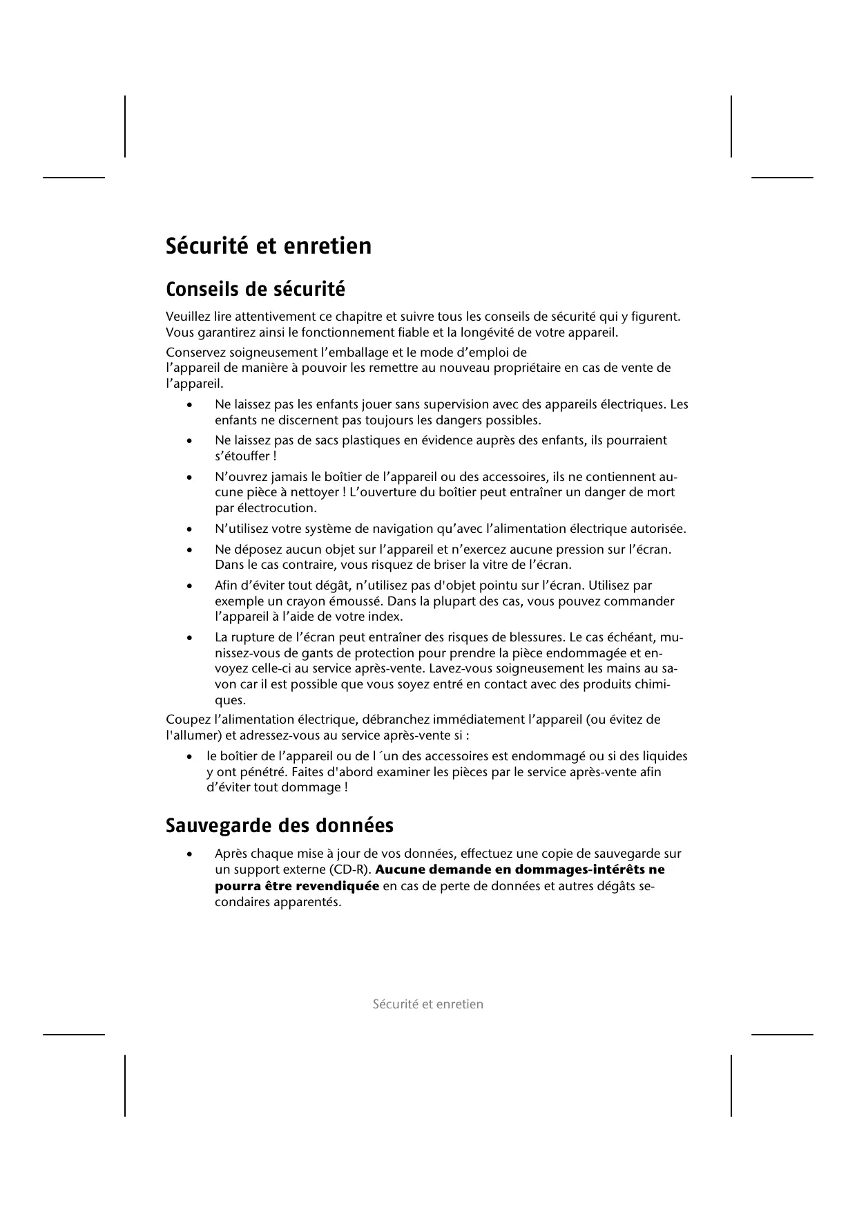Après chaque mise à jour de vos données, effectuez une copie de sauvegarde sur un support externe (CD-R). Aucune demande en dommages-intérêts ne pourra être revendiquée en cas de perte de données et autres dégâts secondaires apparentés.