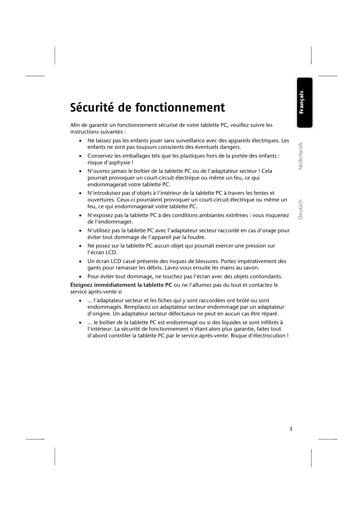 Français Français Sécurité de fonctionnement Afin de garantir un fonctionnement sécurisé de votre tablette PC, veuillez suivre les instructions suivantes : Ne laissez pas les enfants jouer sans surveillance avec des appareils électriques. Les enfants ne sont pas toujours conscients des éventuels dangers.