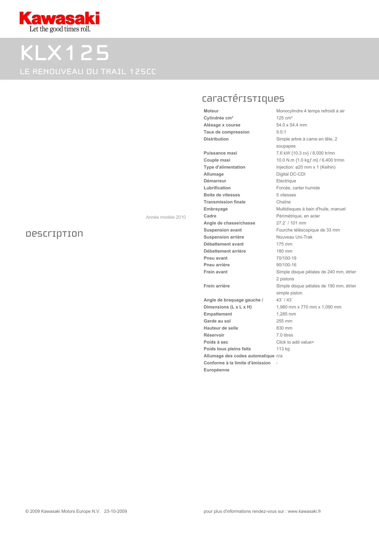 Européenne © 2009 Kawasaki Motors Europe N.V. 23-10-2009 pour plus d'informations rendez-vous sur : www.kawasaki.fr