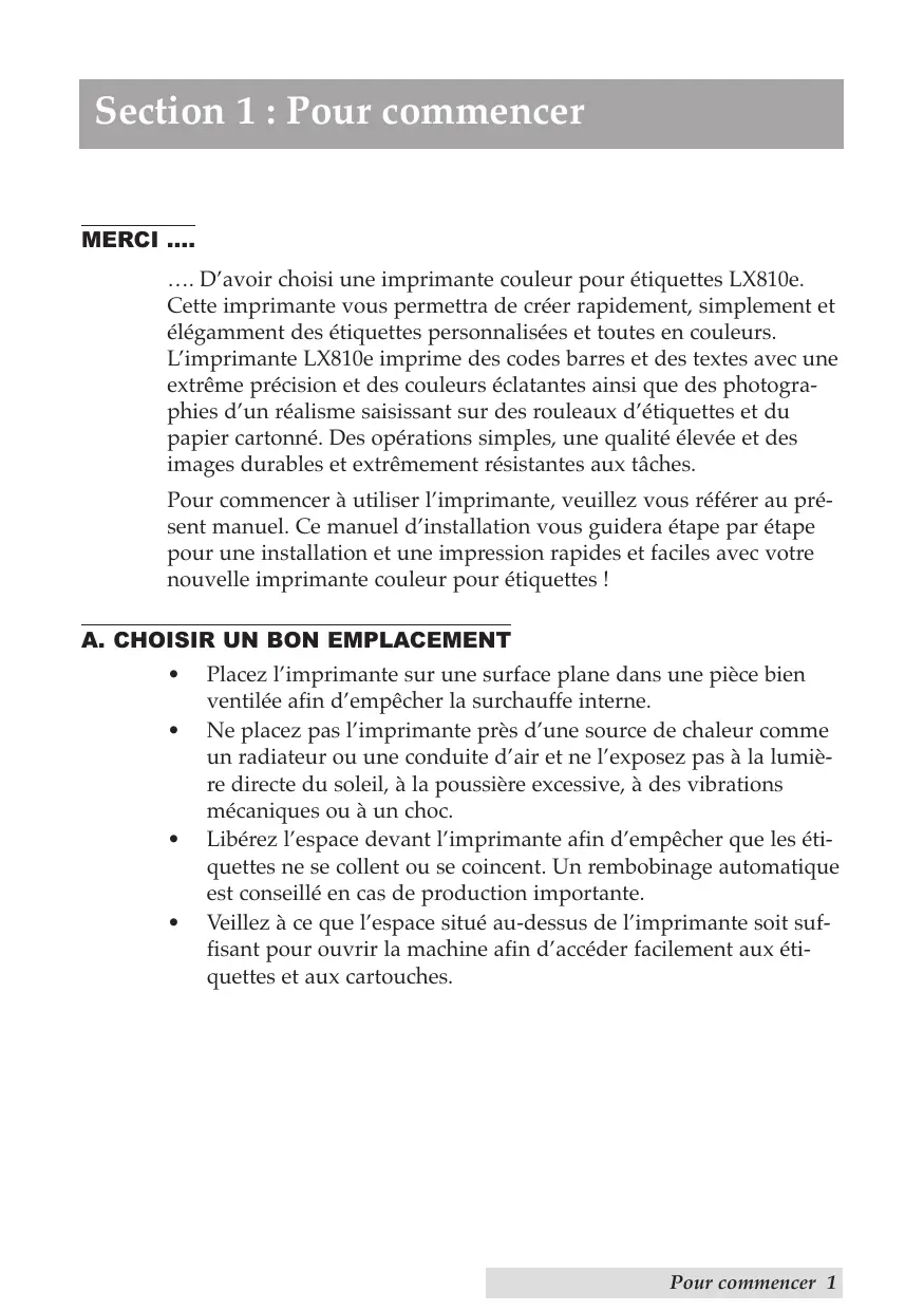 Pour commencer à utiliser l'imprimante, veuillez vous reférer auprésent manuel. Ce manuel d'installation vous guidera étape par étape pour une installation et une impression rapides et facies avec votre nouvelle imprimante couleur pour étiquettes!