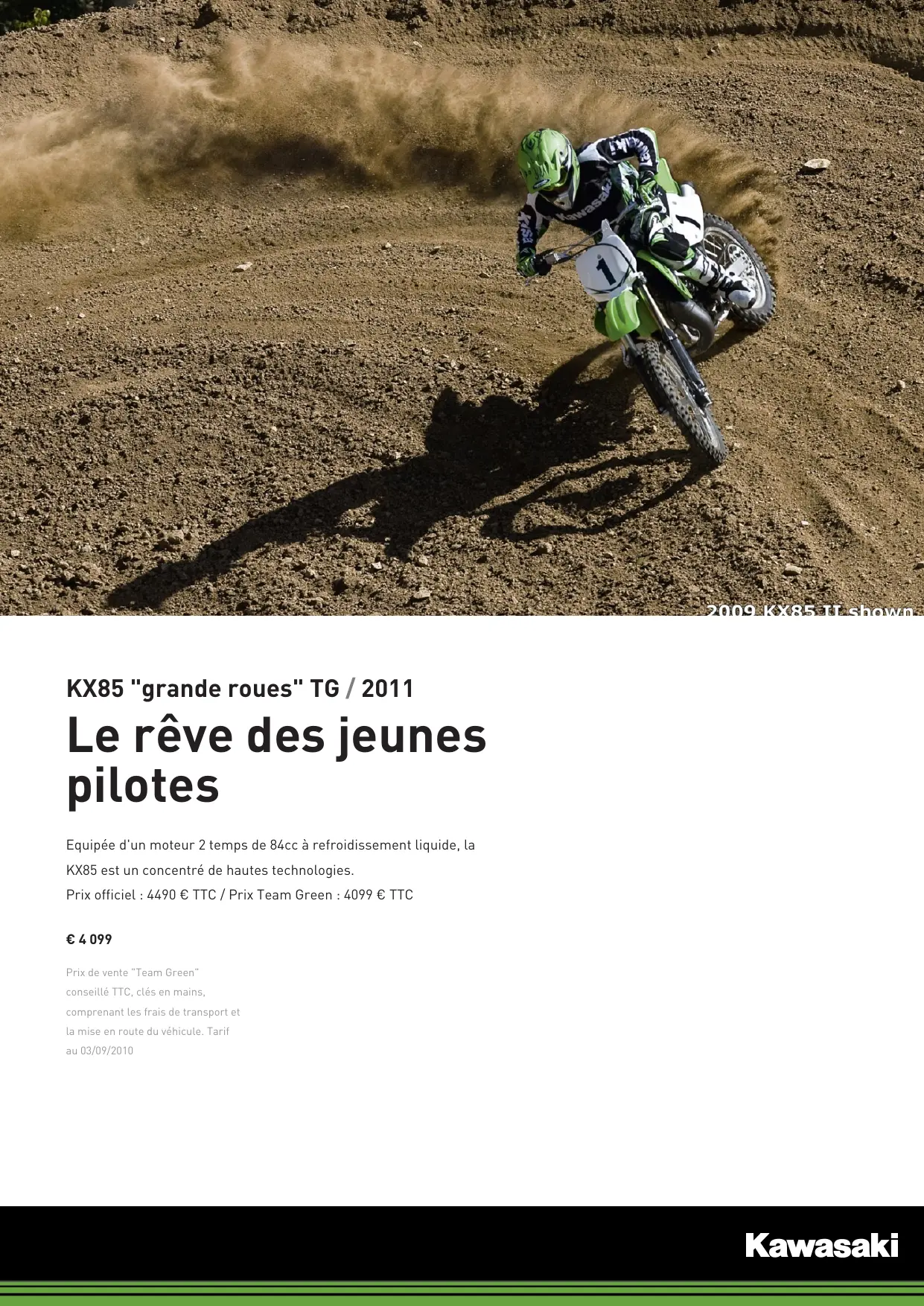 KX85 "grande roues" TG / 2011 Le rêve des jeunes pilotes Equipée d'un moteur 2 temps de 84cc à refroidissement liquide, la KX85 est un concentré de hautes technologies. Prix officiel : 4490 € TTC / Prix Team Green : 4099 € TTC € 4 099 Prix de vente "Team Green" conseillé TTC, clés en mains, comprenant les frais de transport et la mise en route du véhicule. Tarif au 03/09/2010 Description Gardez votre sang-froid KX85 "grande roues" TG / 2011 Restez sur la piste De grands freins pour plus d'informations rendez-vous sur : www.kawasaki.fr © 2011 Kawasaki Motors Europe N.V. Caractéristiques Moteur Moteur KX85 "grande roues" TG / 2011 Dimensions Mono 2 temps, refroidissement Dimensions (L x L x H) 1,910 mm x 735 mm x 1,105 mm liquide, avec KIPS Empattement 1,290 mm 84 cm3 Hauteur de selle 870 mm Alésage x course
