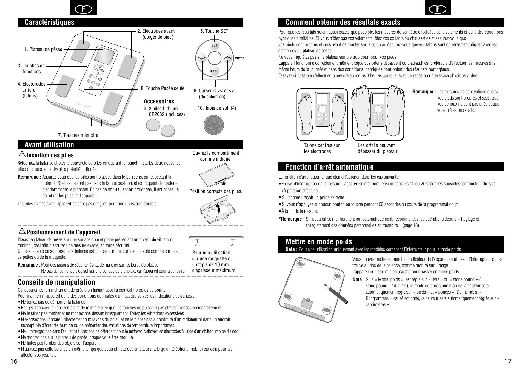 - Caractéristiques Merci d’avoir choisi un impédancemètre Tanita. Cet appareil fait partie de la vaste gamme de produits de santé grand public de Tanita. Ce mode d’emploi vous guide dans les procédures d’installation et vous explique les fonctions principales de l’appareil. Veuillez le garder à portée de main pour vous y référer ultérieurement. Pour toute information complémentaire sur la santé au quotidien, n’hésitez pas à consulter notre site Web www.tanita.com. Les produits Tanita intègrent les dernières recherches cliniques et innovations technologiques. Le Comité consultatif médical de Tanita vérifie toutes les données pour garantir leur validité. Remarque : A lire attentivement et à garder en cas de besoin. Précautions d’emploi L’utilisation d’un impédancemètre par les sujets porteurs d’implants médicaux électroniques tels que les stimulateurs cardiaques est fortement déconseillée, car l’impédancemètre émet un courant électrique de faible intensité qui parcourt le corps et qui risque d’interférer avec son fonctionnement. Les femmes enceintes ne doivent utiliser que la fonction de mesure du poids. Aucune des autres fonctions n’est conçue pour les femmes enceintes. Ne posez pas cet appareil sur une surface glissante telle qu’un sol mouillé. Evitez d’utiliser la balance immédiatement après un bain ou une activité physique fatigante. La balance est glissante lorsqu’elle est mouillée. De plus, des gouttelettes d’eau ou de sueur pourraient activer les touches de l’affichage. Essuyez la balance avec un chiffon propre et sec pour éliminer l’humidité. Vous risquez de perdre des données enregistrées dans l’appareil si vous ne l’utilisez pas correctement ou si vous le soumettez à une surcharge électrique. Tanita ne saurait être tenue responsable de quelques dommages que ce soient, dûs à la perte de données enregistrées. Tanita ne saurait être tenue responsable de quelques dommages ou pertes que ce soient, entraînés par l’usage de cet appareil, ni de quelque réclamation que ce soit provenant de tiers. Remarques importantes à l’intention des utilisateurs Cette balance impédancemètre est destinée aux adultes et enfants âgés de 5 à 17 ans sédentaires ou modérément actifs, ainsi qu’aux adultes pratiquant du sport de façon intensive. Tanita définit « une personne dotée d’une corpulence athlétique » comme une personne effectuant approximativement 10 heures d’activité physique par semaine et dont le rythme cardiaque au repos est inférieur ou égal à 60 battements par minute. Ceci inclut également les personnes ayant eu une activité physique élevée tout au long de leur vie mais dont l’activité physique actuelle ne dépasse pas 10 heures par semaine. La fonction de contrôle du taux de graisse corporelle n’est pas destinée aux femmes enceintes, athlètes professionnels ou culturistes. En cas d’utilisation incorrecte de l’appareil ou de surtension électrique, les données enregistrées peuvent être perdues. Tanita décline toute responsabilité en cas de problème occasionné suite à la perte de données enregistrées. Tanita décline toute responsabilité en cas de perte ou de dommages occasionnés par ses appareils ou en cas de réclamation effectuée par un tiers. Remarque : Le calcul du taux de graisse corporelle varie en fonction du volume d’eau contenu dans l’organisme, et peut également être affecté par la déshydratation ou un niveau hydrique excessif dus à divers facteurs tels que la consommation d’alcool, la période des règles, une maladie, un exercice physique intense, etc. Comment obtenir des résultats exacts p. 21