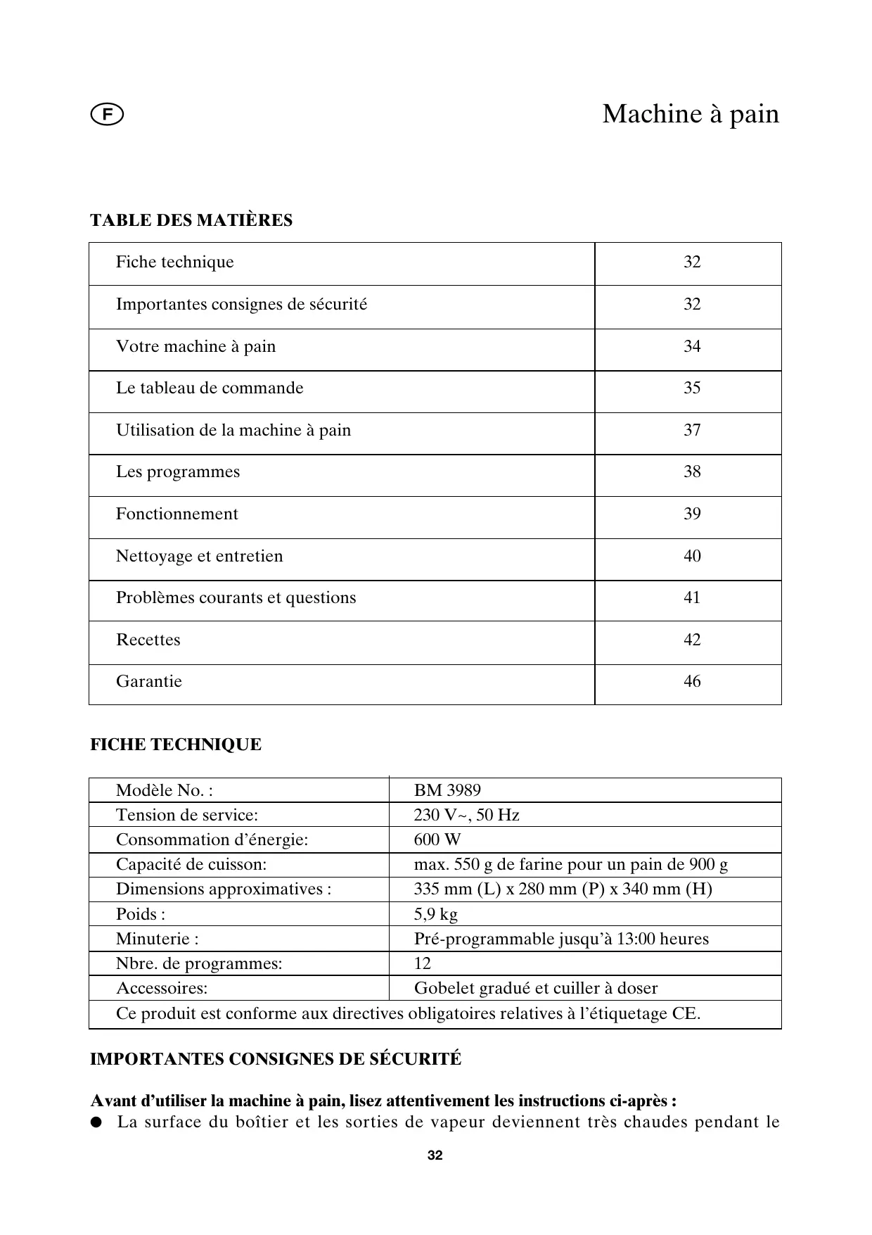 FICHE TECHNIQUE Modèle No. : BM 3989 Tension de service: 230 V~, 50 Hz Consommation d’énergie: 600 W Capacité de cuisson: max. 550 g de farine pour un pain de 900 g Dimensions approximatives : 335 mm (L) x 280 mm (P) x 340 mm (H) Poids : 5,9 kg Minuterie : Pré-programmable jusqu’à 13:00 heures Nbre. de programmes: Accessoires: Gobelet gradué et cuiller à doser Ce produit est conforme aux directives obligatoires relatives à l’étiquetage CE.