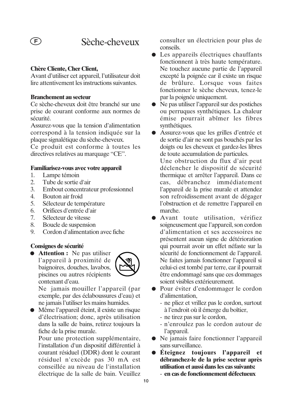 Chère Cliente, Cher Client, Avant d’utiliser cet appareil, l’utilisateur doit lire attentivement les instructions suivantes. Branchement au secteur Ce sèche-cheveux doit être branché sur une prise de courant conforme aux normes de sécurité. Assurez-vous que la tension d’alimentation correspond à la tension indiquée sur la plaque signalétique du sèche-cheveux. Ce produit est conforme à toutes les directives relatives au marquage “CE”.