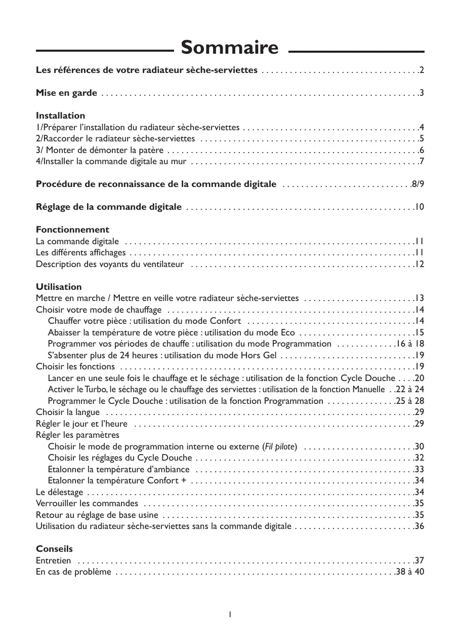& Chauffe-eau EnR Sommaire Les références de votre radiateur sèche-serviettes . . . . . . . . . . . . . . . . . . . . . . . . . . . . . . . . . .2 Mise en garde . . . . . . . . . . . . . . . . . . . . . . . . . . . . . . . . . . . . . . . . . . . . . . . . . . . . . . . . . . . . . . . . . . . .3 Installation 1/Préparer l’installation du radiateur sèche-serviettes . . . . . . . . . . . . . . . . . . . . . . . . . . . . . . . . . . . . . .4 2/Raccorder le radiateur sèche-serviettes . . . . . . . . . . . . . . . . . . . . . . . . . . . . . . . . . . . . . . . . . . . . . . .5 3/ Monter de démonter la patère . . . . . . . . . . . . . . . . . . . . . . . . . . . . . . . . . . . . . . . . . . . . . . . . . . . . . .6 4/Installer la commande digitale au mur . . . . . . . . . . . . . . . . . . . . . . . . . . . . . . . . . . . . . . . . . . . . . . . . .7 Procédure de reconnaissance de la commande digitale . . . . . . . . . . . . . . . . . . . . . . . . . . . .8/9 Réglage de la commande digitale . . . . . . . . . . . . . . . . . . . . . . . . . . . . . . . . . . . . . . . . . . . . . . . . .10 Fonctionnement La commande digitale . . . . . . . . . . . . . . . . . . . . . . . . . . . . . . . . . . . . . . . . . . . . . . . . . . . . . . . . . . . . . .11 Les différents affichages . . . . . . . . . . . . . . . . . . . . . . . . . . . . . . . . . . . . . . . . . . . . . . . . . . . . . . . . . . . . .11 Description des voyants du ventilateur . . . . . . . . . . . . . . . . . . . . . . . . . . . . . . . . . . . . . . . . . . . . . . . .12 Utilisation Mettre en marche / Mettre en veille votre radiateur sèche-serviettes . . . . . . . . . . . . . . . . . . . . . . . .13 Choisir votre mode de chauffage . . . . . . . . . . . . . . . . . . . . . . . . . . . . . . . . . . . . . . . . . . . . . . . . . . . . .14 Chauffer votre pièce : utilisation du mode Confort . . . . . . . . . . . . . . . . . . . . . . . . . . . . . . . . . . . .14 Abaisser la température de votre pièce : utilisation du mode Eco . . . . . . . . . . . . . . . . . . . . . . . . .15 Programmer vos périodes de chauffe : utilisation du mode Programmation . . . . . . . . . . . . .16 à 18 S’absenter plus de 24 heures : utilisation du mode Hors Gel . . . . . . . . . . . . . . . . . . . . . . . . . . . . .19 Choisir les fonctions . . . . . . . . . . . . . . . . . . . . . . . . . . . . . . . . . . . . . . . . . . . . . . . . . . . . . . . . . . . . . . .19 Lancer en une seule fois le chauffage et le séchage : utilisation de la fonction Cycle Douche . . . .20 Activer le Turbo, le séchage ou le chauffage des serviettes : utilisation de la fonction Manuelle . .22 à 24 Programmer le Cycle Douche : utilisation de la fonction Programmation . . . . . . . . . . . . . . .25 à 28 Choisir la langue . . . . . . . . . . . . . . . . . . . . . . . . . . . . . . . . . . . . . . . . . . . . . . . . . . . . . . . . . . . . . . . . . .29 Régler le jour et l’heure . . . . . . . . . . . . . . . . . . . . . . . . . . . . . . . . . . . . . . . . . . . . . . . . . . . . . . . . . . . .29 Régler les paramètres Choisir le mode de programmation interne ou externe (Fil pilote) . . . . . . . . . . . . . . . . . . . . . . . .30 Choisir les réglages du Cycle Douche . . . . . . . . . . . . . . . . . . . . . . . . . . . . . . . . . . . . . . . . . . . . . . .32 Etalonner la température d’ambiance . . . . . . . . . . . . . . . . . . . . . . . . . . . . . . . . . . . . . . . . . . . . . . .33 Etalonner la température Confort + . . . . . . . . . . . . . . . . . . . . . . . . . . . . . . . . . . . . . . . . . . . . . . . .34 Le délestage . . . . . . . . . . . . . . . . . . . . . . . . . . . . . . . . . . . . . . . . . . . . . . . . . . . . . . . . . . . . . . . . . . . . . .34 Verrouiller les commandes . . . . . . . . . . . . . . . . . . . . . . . . . . . . . . . . . . . . . . . . . . . . . . . . . . . . . . . . . .35 Retour au réglage de base usine . . . . . . . . . . . . . . . . . . . . . . . . . . . . . . . . . . . . . . . . . . . . . . . . . . . . . .35 Utilisation du radiateur sèche-serviettes sans la commande digitale . . . . . . . . . . . . . . . . . . . . . . . . . .36 Conseils Entretien . . . . . . . . . . . . . . . . . . . . . . . . . . . . . . . . . . . . . . . . . . . . . . . . . . . . . . . . . . . . . . . . . . . . . . . .37 En cas de problème . . . . . . . . . . . . . . . . . . . . . . . . . . . . . . . . . . . . . . . . . . . . . . . . . . . . . . . . . . . .38 à 40