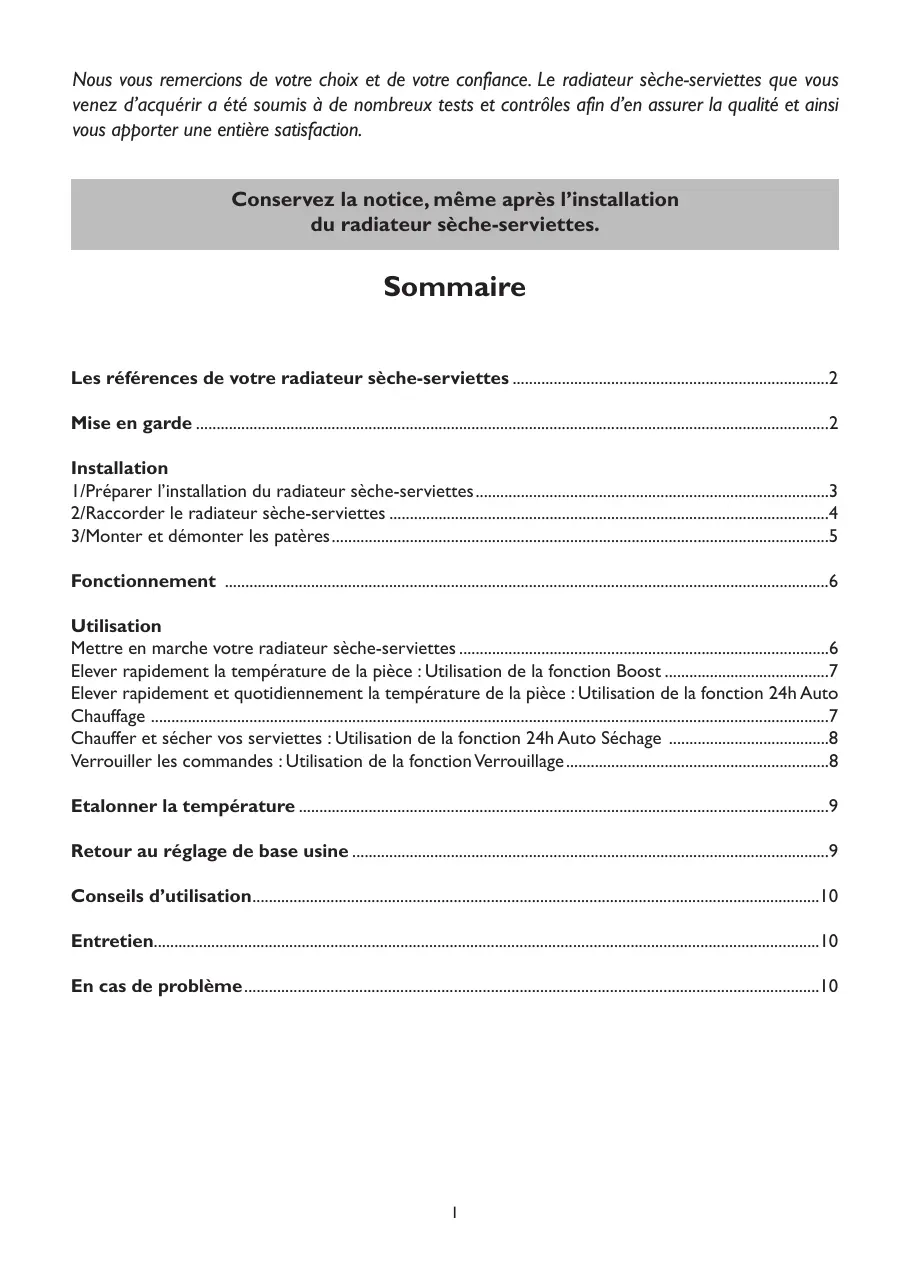 Sommaire Les références de votre radiateur sèche-serviettes 2 Mise en garde 2 Installation 1/Préparer l’installation du radiateur sèche-serviettes3 2/Raccorder le radiateur sèche-serviettes 4 3/Monter et démonter les patères5 Fonctionnement 6 Utilisation Mettre en marche votre radiateur sèche-serviettes 6 Elever rapidement la température de la pièce : Utilisation de la fonction Boost 7 Elever rapidement et quotidiennement la température de la pièce : Utilisation de la fonction 24h Auto Chauffage 7 Chauffer et sécher vos serviettes : Utilisation de la fonction 24h Auto Séchage 8 Verrouiller les commandes : Utilisation de la fonction Verrouillage 8 Etalonner la température 9 Retour au réglage de base usine 9 Conseils d’utilisation10 Entretien10 En cas de problème10