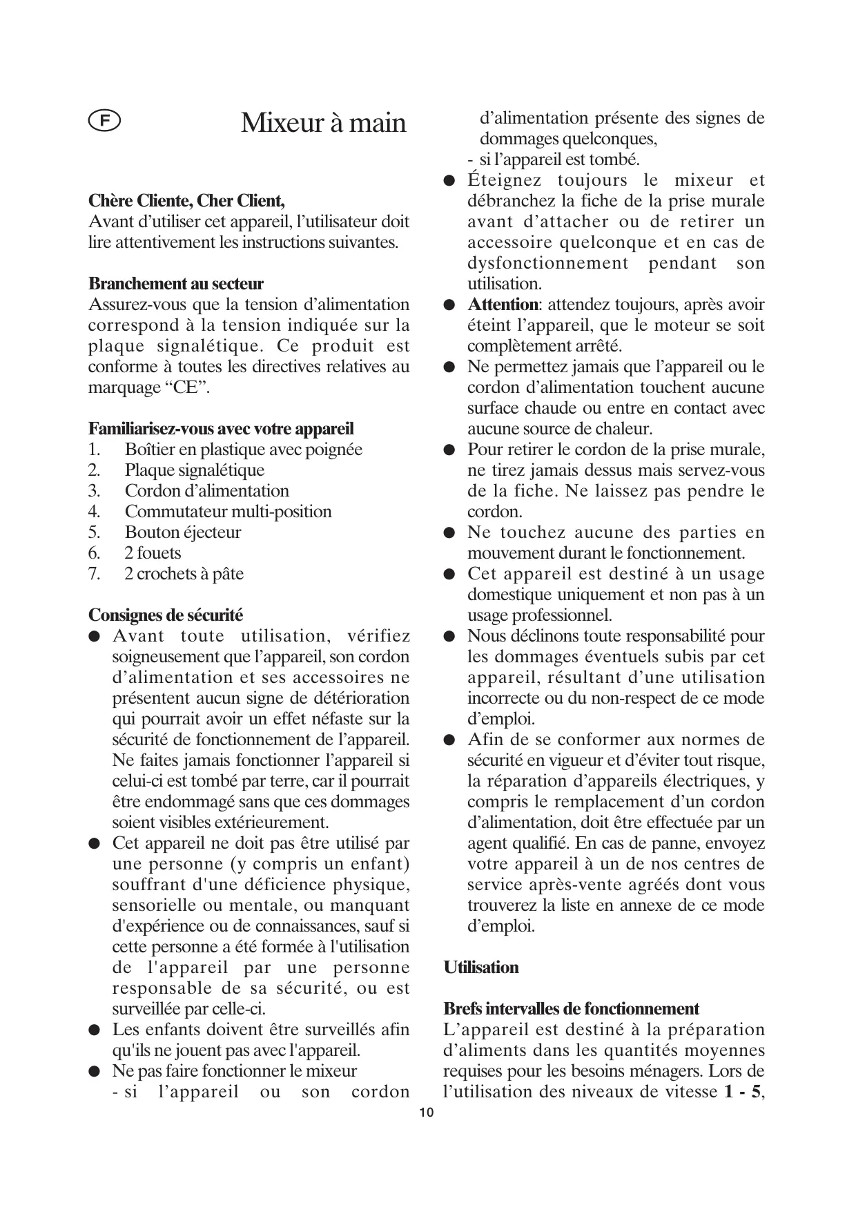 Éteignez toujours le mixeur et débranchez la fiche de la prise murale avant d’attacher ou de retirer un accessoire quelconque et en cas de dysfonctionnement pendant son utilisation. Attention: attendez toujours, après avoir éteint l’appareil, que le moteur se soit complètement arrêté. Ne permettez jamais que l’appareil ou le cordon d’alimentation touchent aucune surface chaude ou entre en contact avec aucune source de chaleur. Pour retirer le cordon de la prise murale, ne tirez jamais dessus mais servez-vous de la fiche. Ne laissez pas pendre le cordon. Ne touchez aucune des parties en mouvement durant le fonctionnement. Cet appareil est destiné à un usage domestique uniquement et non pas à un usage professionnel. Nous déclinons toute responsabilité pour les dommages éventuels subis par cet appareil, résultant d’une utilisation incorrecte ou du non-respect de ce mode d'emploi. Afin de se conformer aux normes de sécurité en vigueur et d’éviter tout risque, la réparation d'appareils électriques, y compris le remplacement d’un cordon d’alimentation, doit être effectuée par un agent qualifié. En cas de panne, envoyez votre appareil à un de nos centres de service après-vente agréés dont vous trouverez la liste en annexe de ce mode d'emploi.