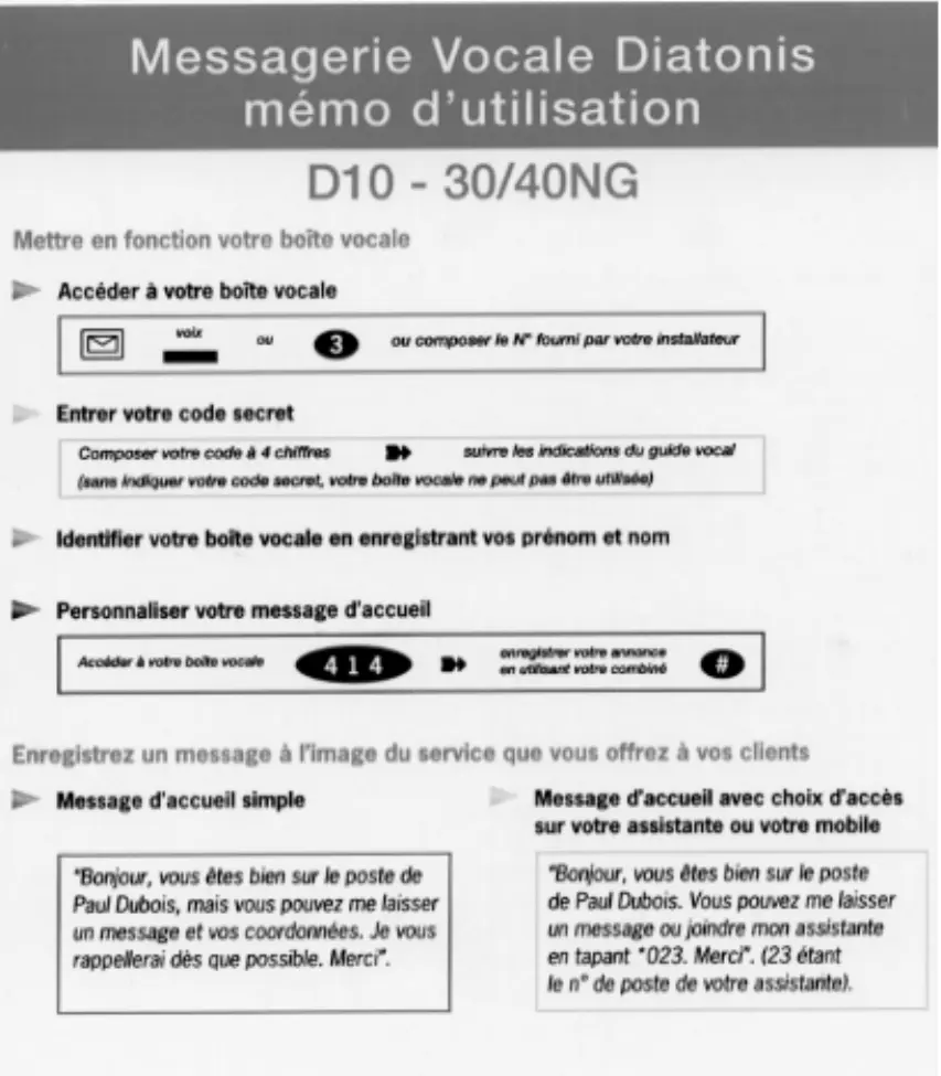 "Bonjour, vous étés bien sur le poste de Paul Dubois. Vous pouvez me laisser un message ou joindre mon assistanté en tapant "023. Merci". (23 étant le n° de poste de votre assistanté).