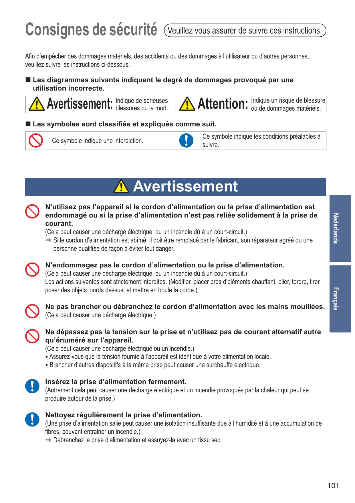blessures ou la mort. un risque de blessure Attention: Indique ou de dommages matériels. Les symboles sont classifiés et expliqués comme suit. Ce symbole indique une interdiction. Ce symbole indique les conditions préalables à suivre. Avertissement Ne pas brancher ou débranchez le cordon d’alimentation avec les mains mouillées. (Cela peut causer une décharge électrique.) Français N’endommagez pas le cordon d’alimentation ou la prise d’alimentation. (Cela peut causer une décharge électrique, ou un incendie dû à un court-circuit.) Les actions suivantes sont strictement interdites. (Modifier, placer près d’éléments chauffant, plier, tordre, tirer, poser des objets lourds dessus, et mettre en boule la corde.) Nederlands N’utilisez pas l’appareil si le cordon d’alimentation ou la prise d’alimentation est endommagé ou si la prise d’alimentation n’est pas reliée solidement à la prise de courant. (Cela peut causer une décharge électrique, ou un incendie dû à un court-circuit.) Si le cordon d’alimentation est abîmé, il doit être remplacé par le fabricant, son réparateur agréé ou une personne qualifiée de façon à éviter tout danger. Ne dépassez pas la tension sur la prise et n’utilisez pas de courant alternatif autre qu’énuméré sur l’appareil. (Cela peut causer une décharge électrique ou un incendie.) ● Assurez-vous que la tension fournie à l’appareil est identique à votre alimentation locale. ● Brancher d’autres dispositifs à la même prise peut causer une surchauffe électrique. Insérez la prise d’alimentation fermement. (Autrement cela peut causer une décharge électrique et un incendie provoqués par la chaleur qui peut se produire autour de la prise.) Nettoyez régulièrement la prise d’alimentation. (Une prise d’alimentation salie peut causer une isolation insuffisante due à l’humidité et à une accumulation de fibres, pouvant entrainer un incendie.) Débranchez la prise d’alimentation et essuyez-la avec un tissu sec.