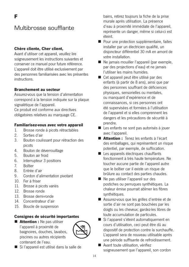 Multibrosse soufflante Chère cliente, Cher client, Avant d'utiliser cet appareil, veuillez lire soigneusement les instructions suivantes et conserver ce manuel pour future référence. L'appareil doit être utilisé exclusivement par des personnes familiarisées avec les présentes instructions. Branchement au secteur Assurezaous que la tension d'alimentation correspond à la tension indiquée sur la plaque signalétique de l'appareil. Ce produit est conforme aux directives obligatoires relatives au marquage CE. ez-vous avec votre apparei