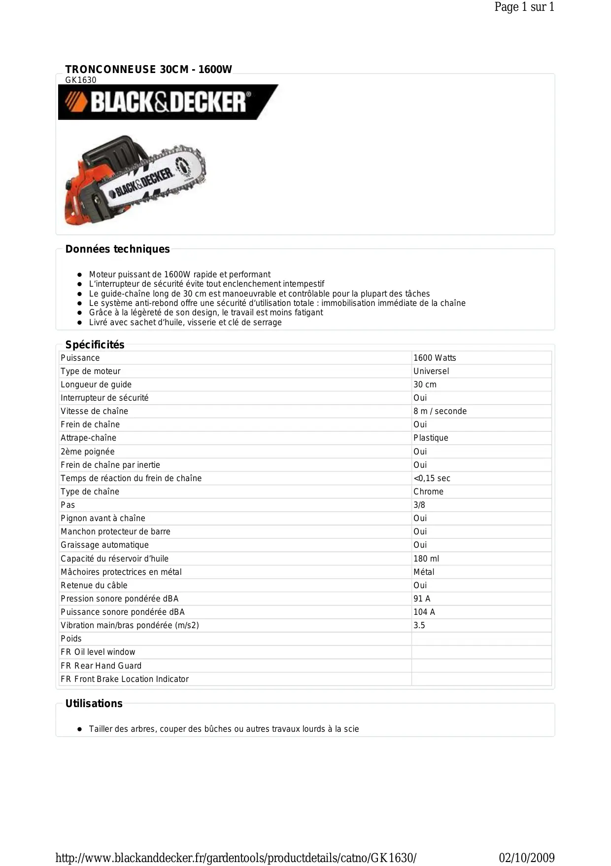 Poids FR Oil level window FR Rear Hand Guard FR Front Brake Location Indicator Utilisations Tailler des arbres, couper des bûches ou autres travaux lourds à la scie http://www.blackanddecker.fr/gardentools/productdetails/catno/GK1630/ 02/10/2009
