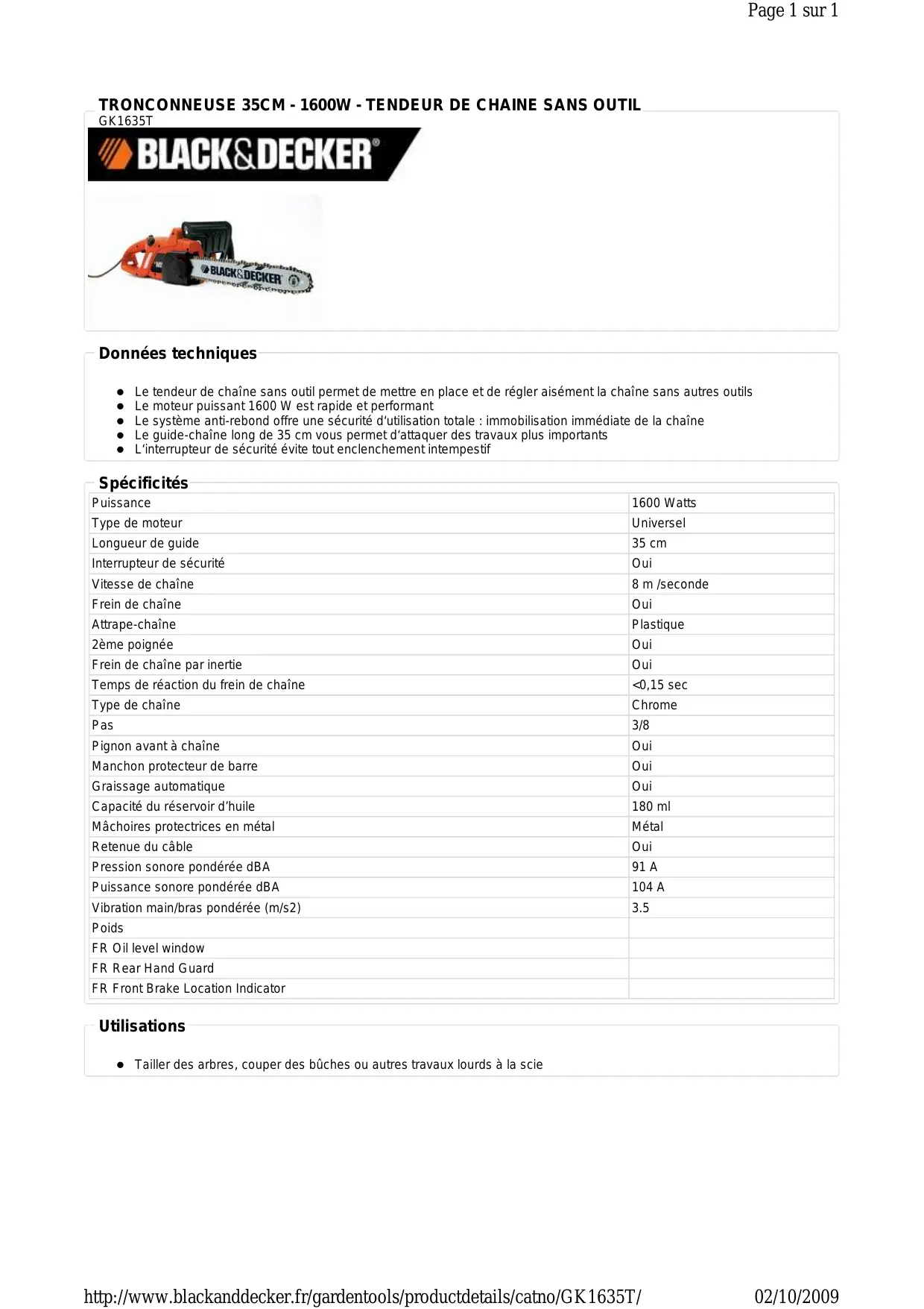 Poids FR Oil level window FR Rear Hand Guard FR Front Brake Location Indicator Utilisations Tailler des arbres, couper des bûches ou autres travaux lourds à la scie http://www.blackanddecker.fr/gardentools/productdetails/catno/GK1635T/ 02/10/2009