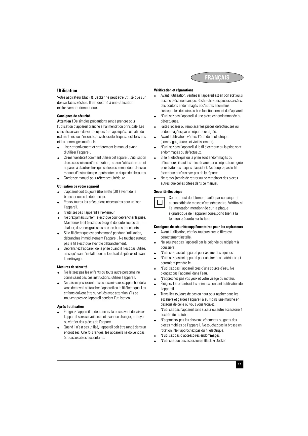 X Avant l’utilisation, vérifiez si l'appareil est en bon état ou si aucune pièce ne manque. Recherchez des pièces cassées, des boutons endommagés et d'autres anomalies susceptibles de nuire au bon fonctionnement de l’appareil. X N’utilisez pas l’appareil si une pièce est endommagée ou défectueuse. X Faites réparer ou remplacer les pièces défectueuses ou endommagées par un réparateur agréé. X Avant l’utilisation, vérifiez l’état du fil électrique (dommages, usures et vieillissement). X N’utilisez pas l’appareil si le fil électrique ou la prise sont endommagés ou défectueux. X Si le fil électrique ou la prise sont endommagés ou défectueux, il faut les faire réparer par un réparateur agréé pour éviter les risques d'accident. Ne coupez pas le fil électrique et n’essayez pas de le réparer. X Ne tentez jamais de retirer ou de remplacer des pièces autres que celles citées dans ce manuel. Sécurité électrique Cet outil est doublement isolé; par conséquent, aucun câble de masse n'est nécessaire. Vérifiez si l’alimentation mentionnée sur la plaque signalétique de l’appareil correspond bien à la tension présente sur le lieu. Consignes de sécurité supplémentaires pour les aspirateurs Avant l’utilisation, vérifiez toujours que le filtre est correctement installé. X Ne soulevez pas l’appareil par la poignée du récipient à poussière. X N’utilisez pas cet appareil pour aspirer des liquides. X N’utilisez pas cet appareil pour aspirer des matériaux qui pourraient prendre feu. X N’utilisez pas l’appareil près d’une source d’eau. Ne plongez pas l’appareil dans l’eau. X N’approchez pas vos yeux et votre visage du moteur. X Éloignez les enfants et les animaux pendant l’utilisation de l’appareil. X Travaillez toujours de bas en haut pour aspirer dans les escaliers et gardez l’appareil à au moins une marche en dessous de celle où vous vous trouvez. X N’utilisez pas l’appareil sans suceur ou autre accessoire à l’extrémité du tube. X N'approchez pas les cheveux, vêtements ou gants des pièces mobiles de l'appareil. Ne touchez pas la brosse en rotation. Ne l’approchez pas du fil électrique. X N’utilisez pas d’accessoires endommagés. X N’utilisez que des accessoires Black & Decker. X