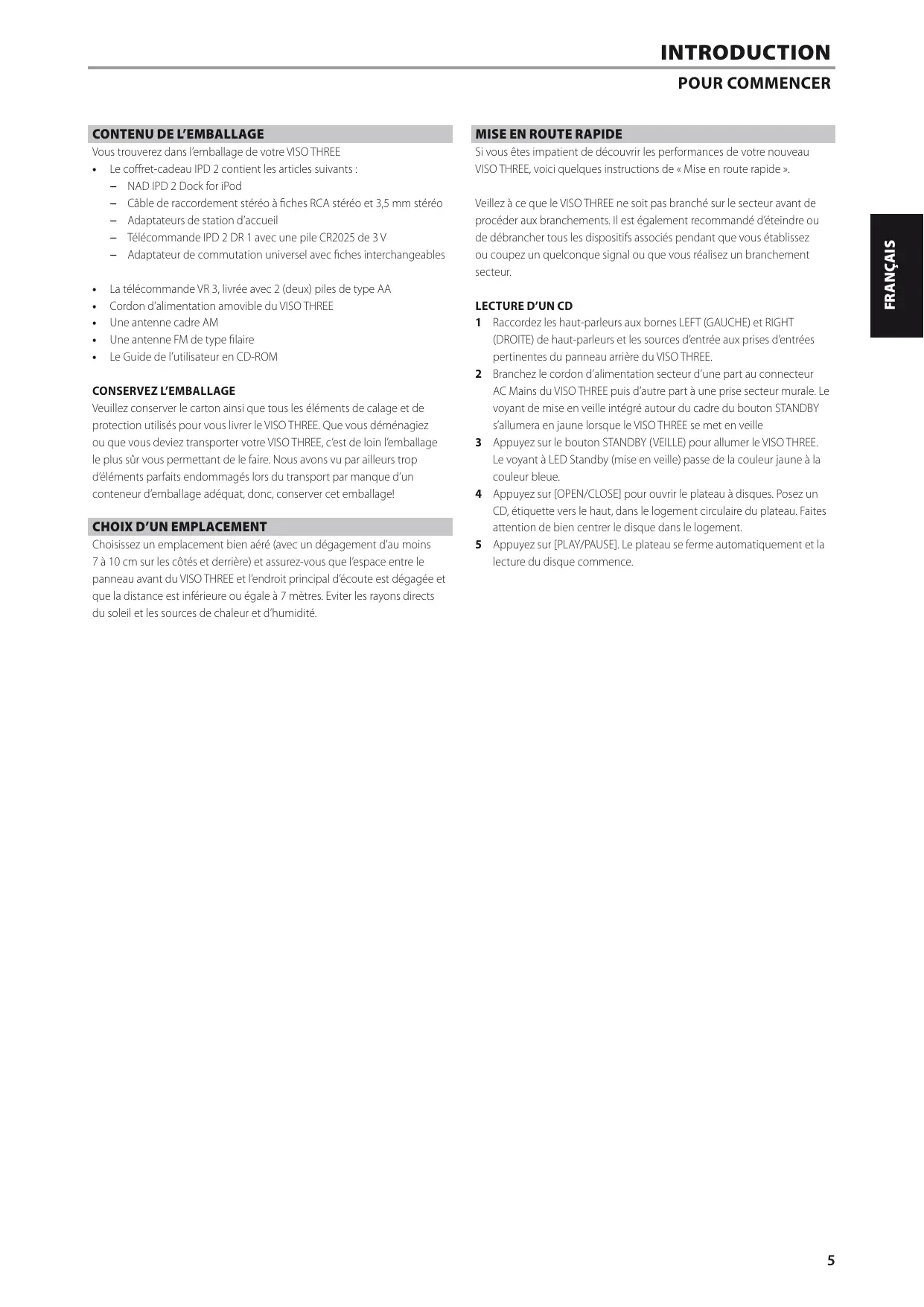 POUR COMMENCER 5 CONTENU DE L'EMBALLAGE .5 CHOIX D'UN EMPLACEMENT .5 MISE EN ROUTE RAPIDE .5