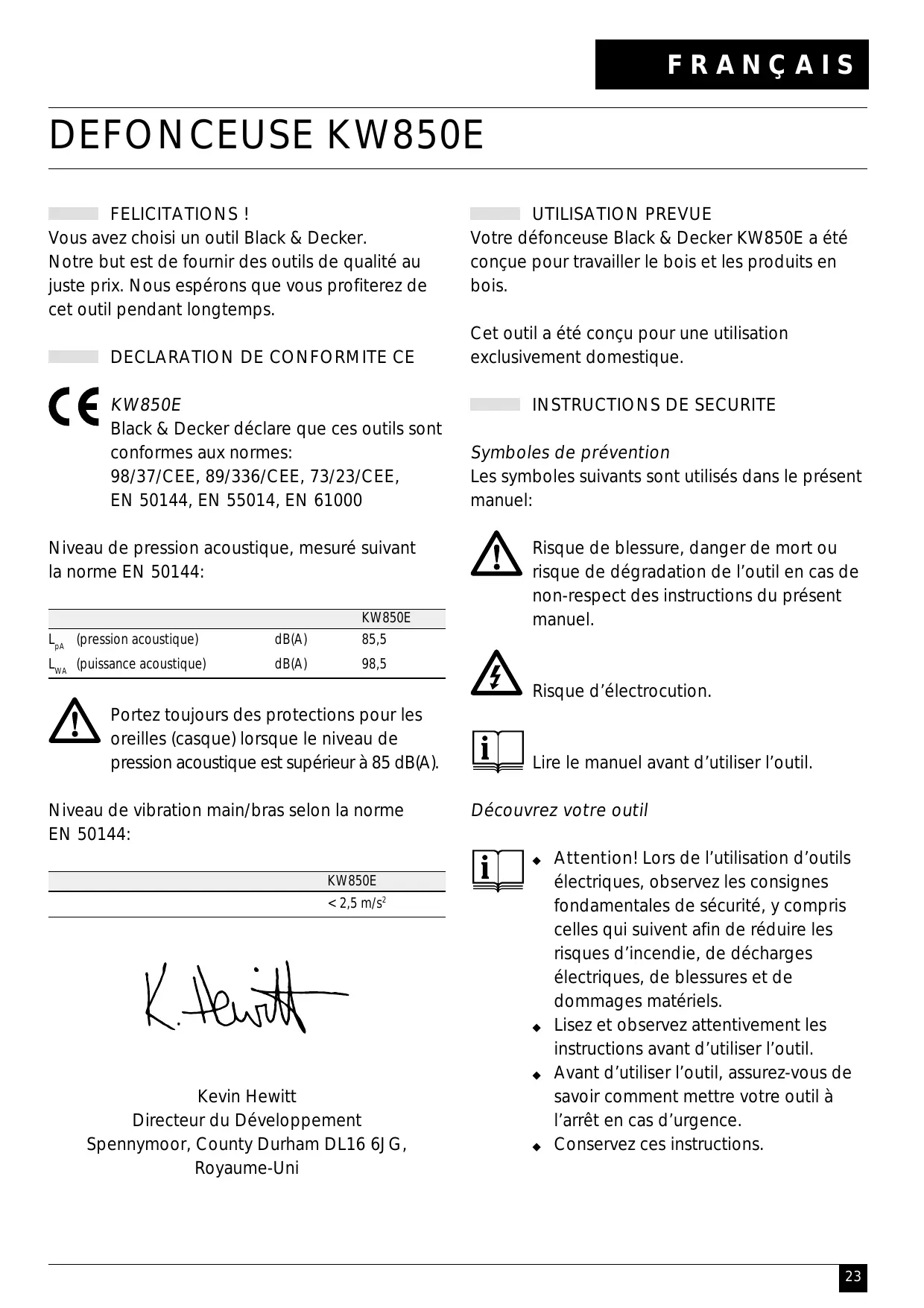 Black & Decker déclare que ces outils sont conformes aux normes: 98/37/CEE, 89/336/CEE, 73/23/CEE, EN 50144, EN 55014, EN 61000