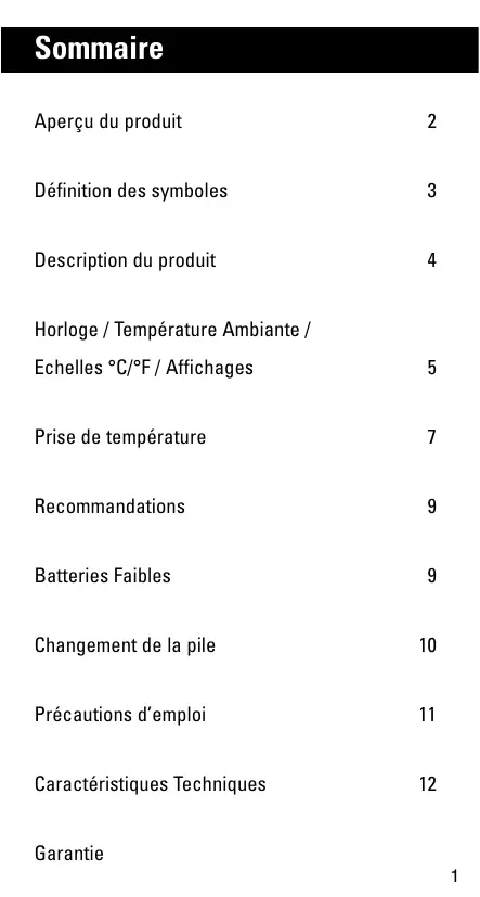 Précautions d’emploi • La sonde de votre thermomètre est étanche et peut être nettoyée à l’aide d’une lingette désinfectante ou autre coton imbibé d’alcool. • Le corps du thermomètre n’est pas étanche, ne pas le tremper dans un liquide, utiliser un tissu sec et propre. • Eviter d’exposer longuement le thermomètre à des températures extrêmes, par exemple au soleil dans une voiture. • Eviter les chocs violents et la chute du produit • Eviter le contact direct des doigts avec l’extrémité de la sonde • Ne pas tenter de démonter l’appareil • Ce thermomètre a été conçu pour être utilisé sans couvre sonde, il est inutile d’utiliser de tels couvre sondes. • Garder la sonde propre, la graisse et le cérumen peuvent affecter le résultat des mesures infra rouges. • Ne pas prendre de mesure à moins d’une demi heure d’un repas, d’un exercice, d’un bain ou d’un séjour dans environnement particulièrement froid ou chaud. • Espacer les prises de mesures d’au moins 1 minute, sinon de légères variations risquent d’apparaître. • La température corporelle d’un individu correspond à une valeur moyenne. Il n’y a pas de standard absolu pour la température corporelle. La meilleure façon de procéder est de mesurer votre température en période normale et de vous servir de cette mesure moyenne comme référence pour juger de votre fièvre. • Quand la température ambiante est en dehors de la plage de température optimale de fonctionnement comprise entre 16°C et 40°C un message d’erreur « Err » apparaît (11)