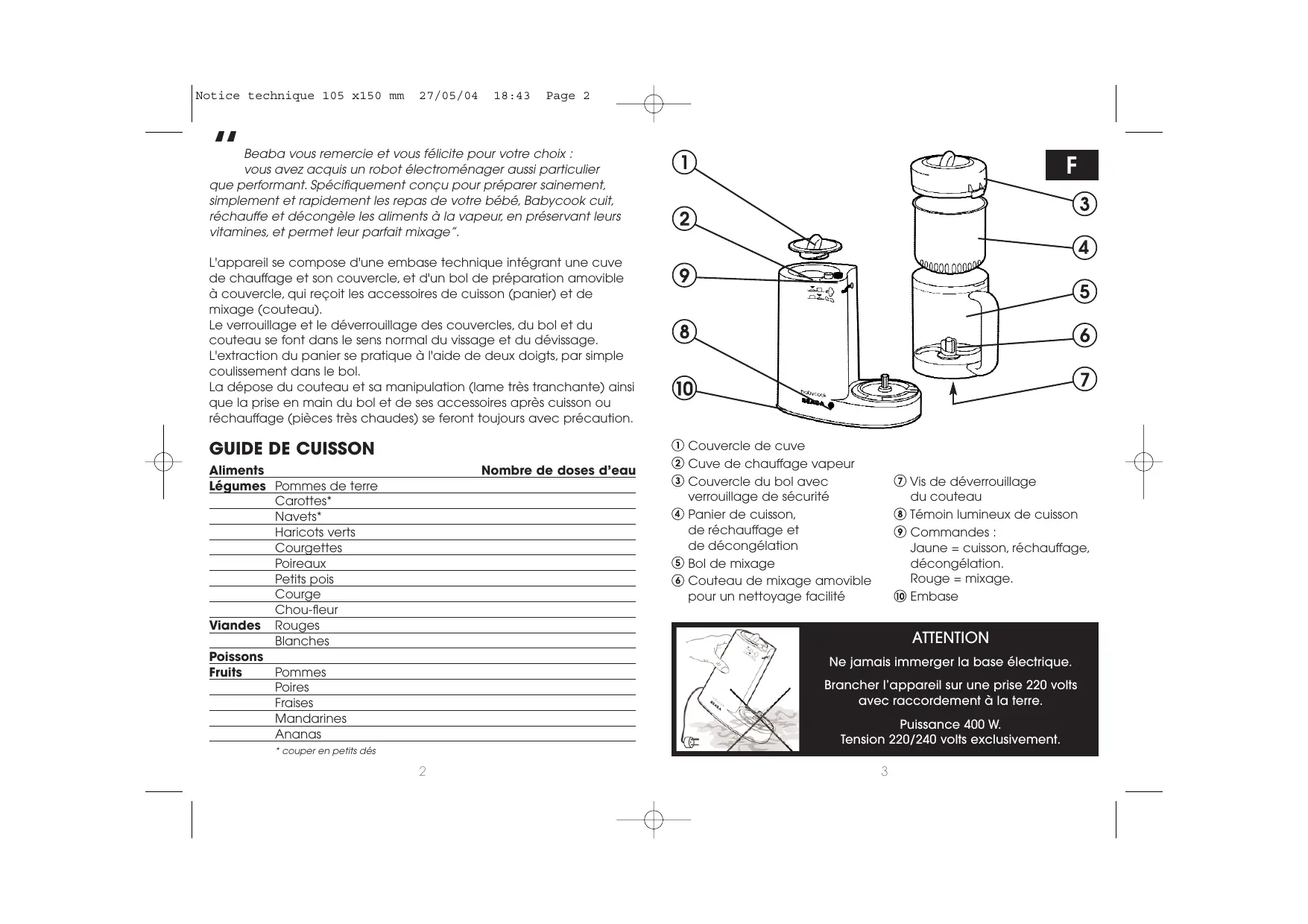 ATTENTION Ne jamais immerger la base électrique. Brancher l’appareil sur une prise 220 volts avec raccordement à la terre. Puissance 400 W. Tension 220/240 volts exclusivement.