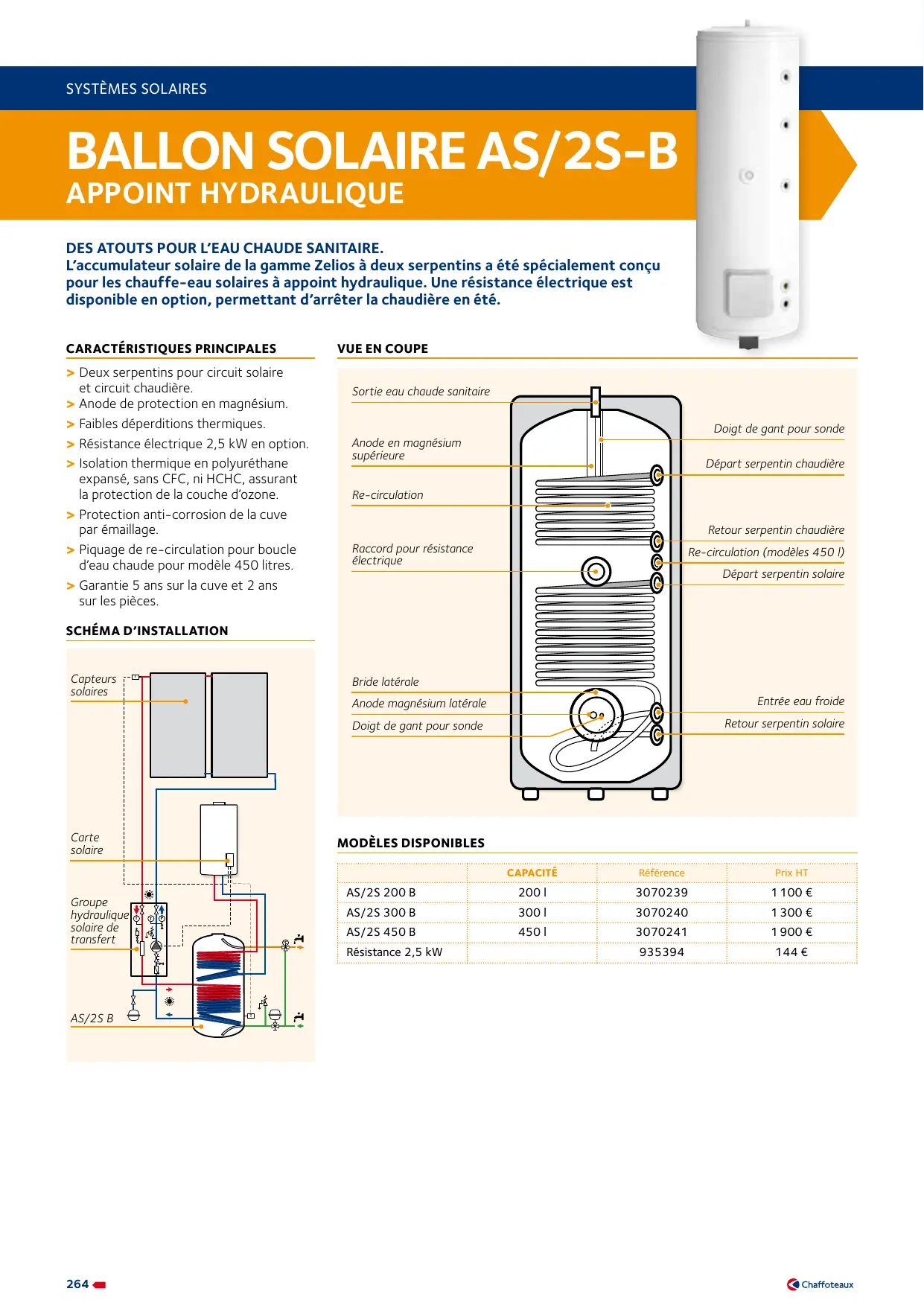 144 € Résistance 2,5 kW Capacité 200-450 l Appoint HYDRAULIQUe ballon solaire AS/2SB caractéristiques techniques 200 l 300 l 450 l