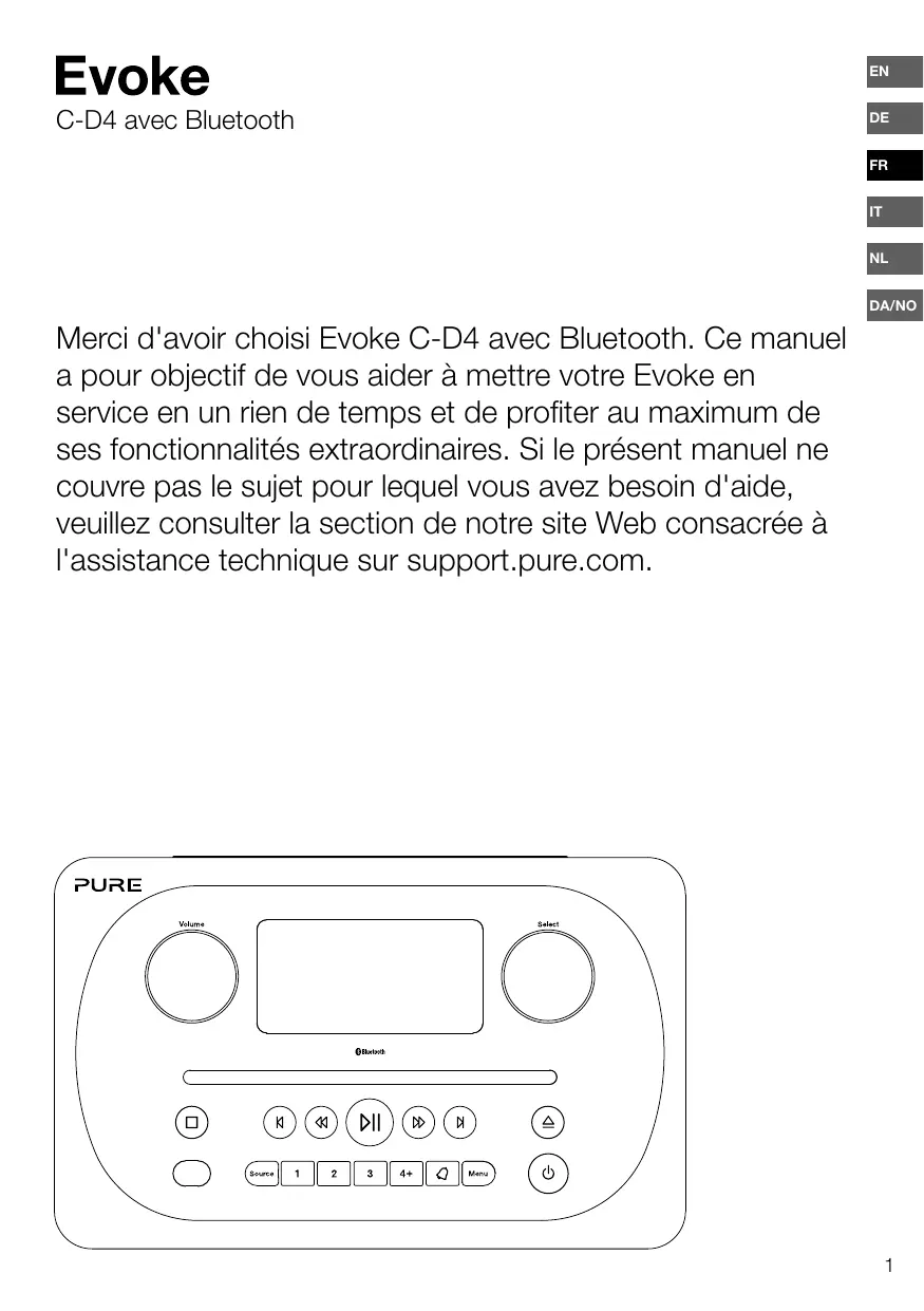 DA/NO Merci d'avoir choisi Evoke C-D4 avec Bluetooth. Ce manuel a pour objectif de vous aider à mettre votre Evoke en service en un rien de temps et de profiter au maximum de ses fonctionnalités extraordinaires. Si le présent manuel ne couvre pas le sujet pour lequel vous avez besoin d'aide, veuillez consulter la section de notre site Web consacrée à l'assistance technique sur support.pure.com.