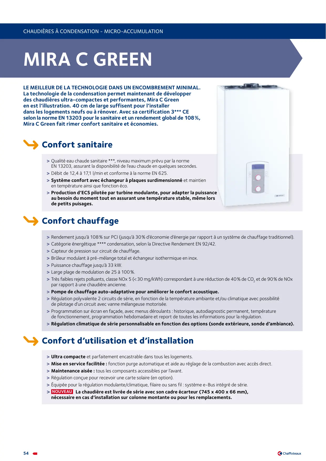 Largeur 40 cm Puissance 25-35 kW Capacité ECS micro-accumulation Technologie condensation mira c green caractéristiques techniques