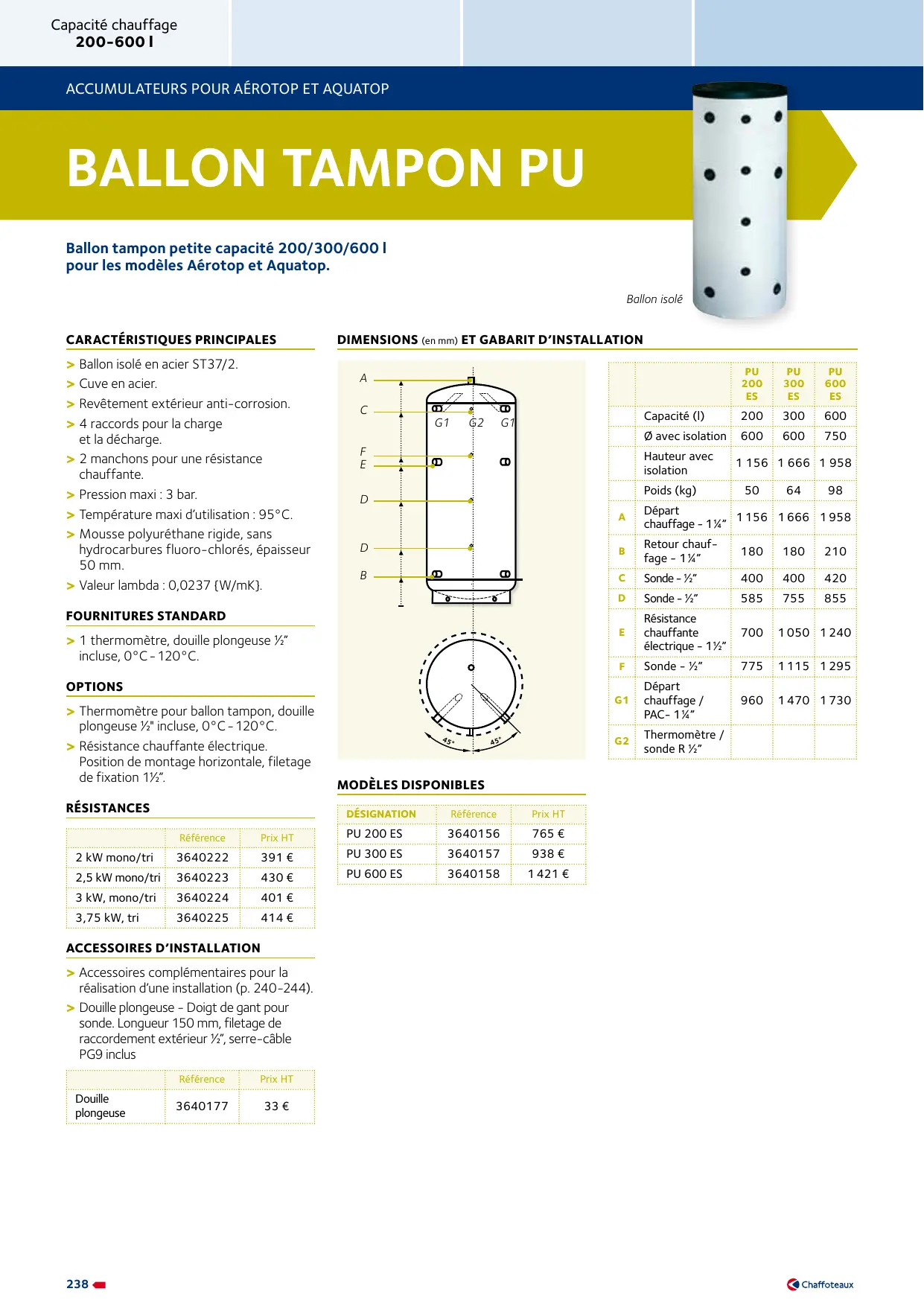 Capacité chauffage 200-600 l accumulateurs pour aérotop et aquatop Ballon tampon PU Ballon tampon petite capacité 200/300/600 l pour les modèles Aérotop et Aquatop. Ballon isolé Caractéristiques principales >> Ballon isolé en acier ST37/2. >> Cuve en acier. >> Revêtement extérieur anti-corrosion. >> 4 raccords pour la charge et la décharge. >> 2 manchons pour une résistance chauffante. >> Pression maxi : 3 bar. >> Température maxi d’utilisation : 95°C. >> Mousse polyuréthane rigide, sans hydrocarbures fluoro-chlorés, épaisseur 50 mm. >> Valeur lambda : 0,0237 {W/mK}. DIMENSIONS (en mm) et gabarit d’installation