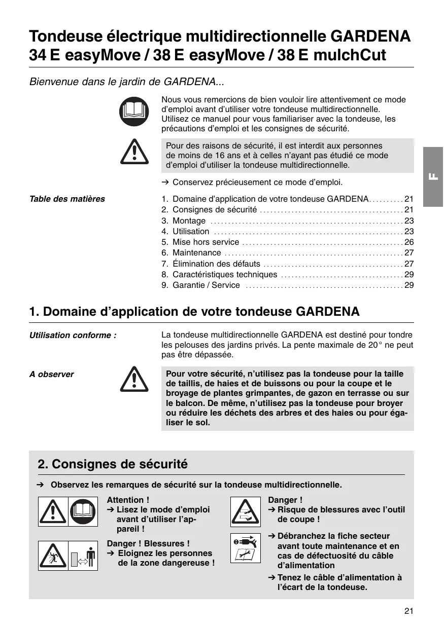 - Domaine d’application de votre tondeuse GARDENA p. 21