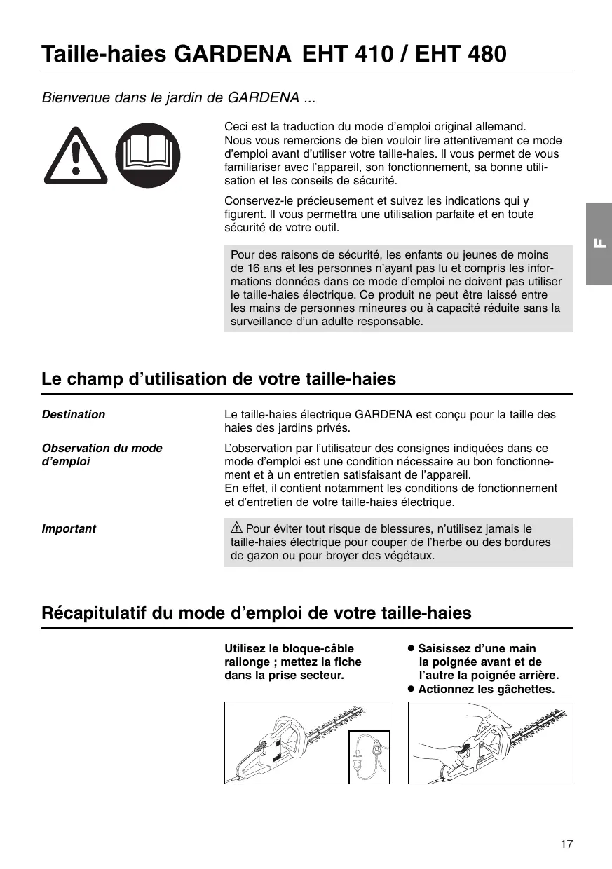 Taille-haies GARDENA EHT 410 / EHT 480 Bienvenue dans le jardin de GARDENA ... Ceci est la traduction du mode d’emploi original allemand. Nous vous remercions de bien vouloir lire attentivement ce mode d’emploi avant d’utiliser votre taille-haies. Il vous permet de vous familiariser avec l’appareil, son fonctionnement, sa bonne utilisation et les conseils de sécurité.